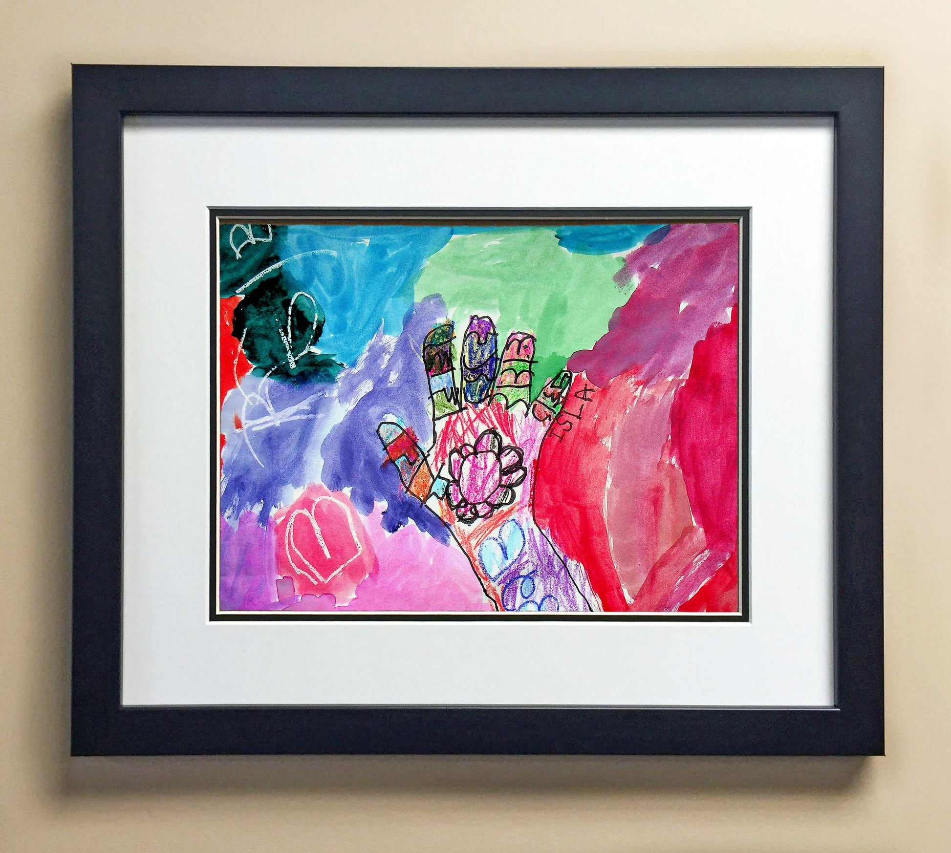 Included with the purchase is the Students Artwork, Frame, double matboard, shatter proof plexiglass, and a ready to hang backerboard with turnbuttons