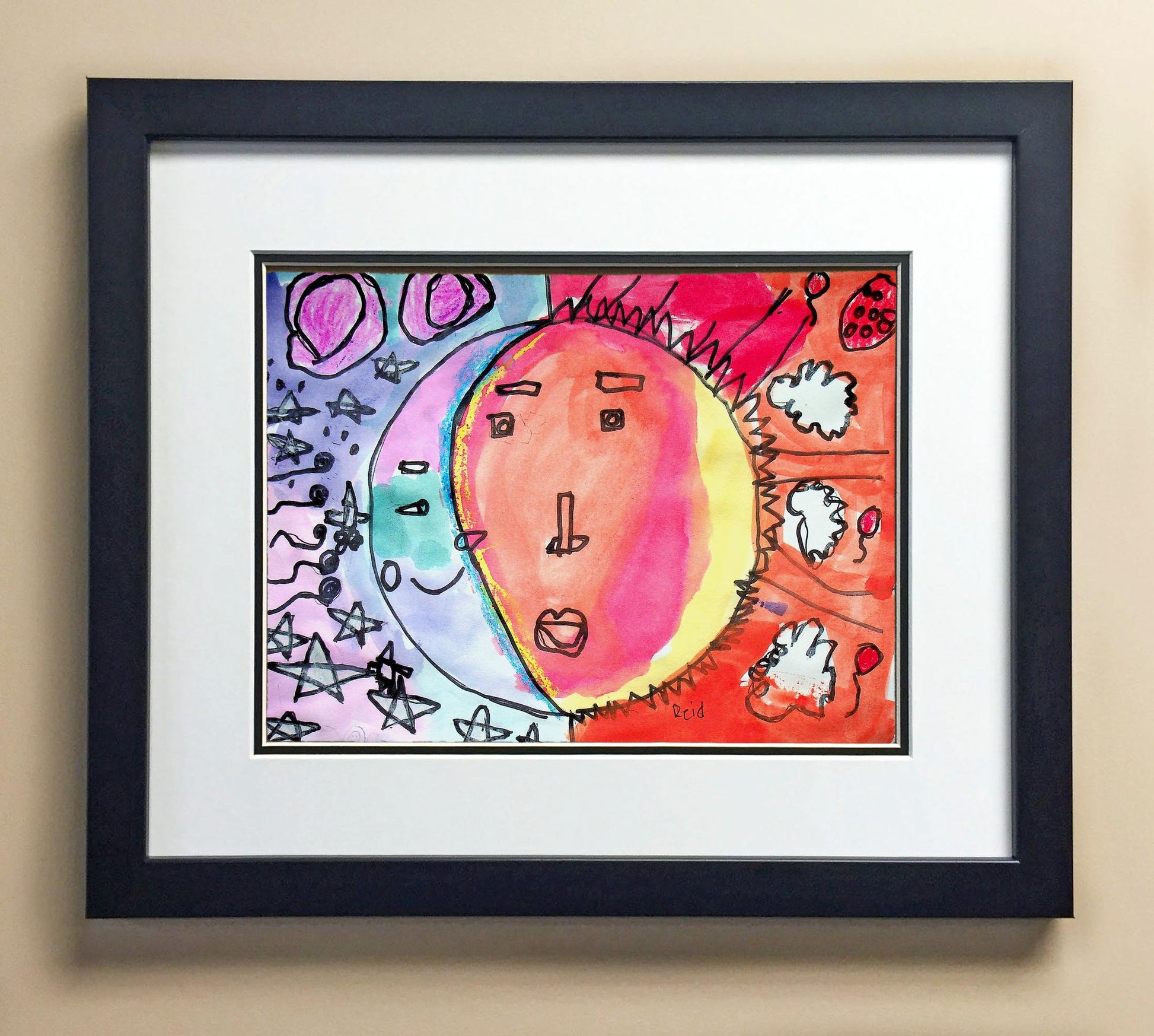 Included with the purchase is the Students Artwork, Frame, double matboard, shatter proof plexiglass, and a ready to hang backerboard with turnbuttons