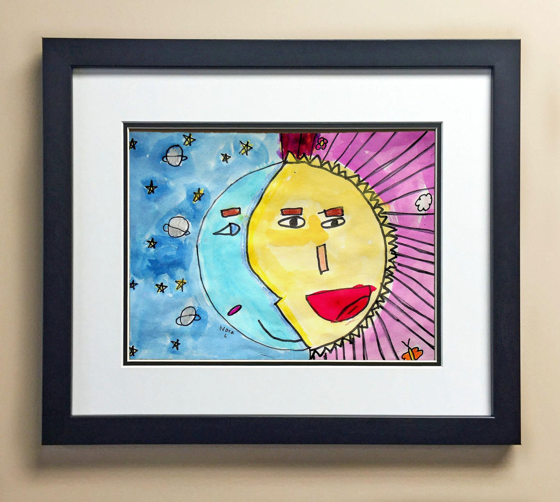 Included with the purchase is the Students Artwork, Frame, double matboard, shatter proof plexiglass, and a ready to hang backerboard with turnbuttons