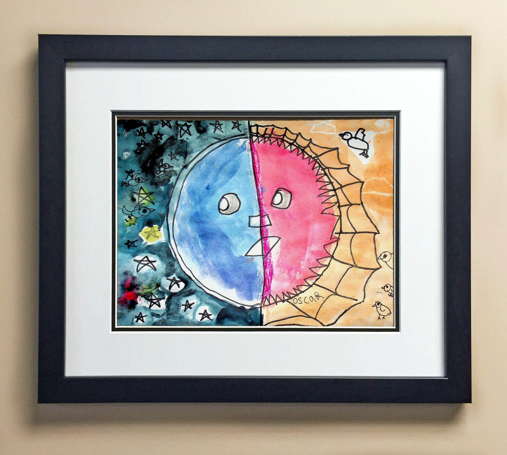 Included with the purchase is the Students Artwork, Frame, double matboard, shatter proof plexiglass, and a ready to hang backerboard with turnbuttons