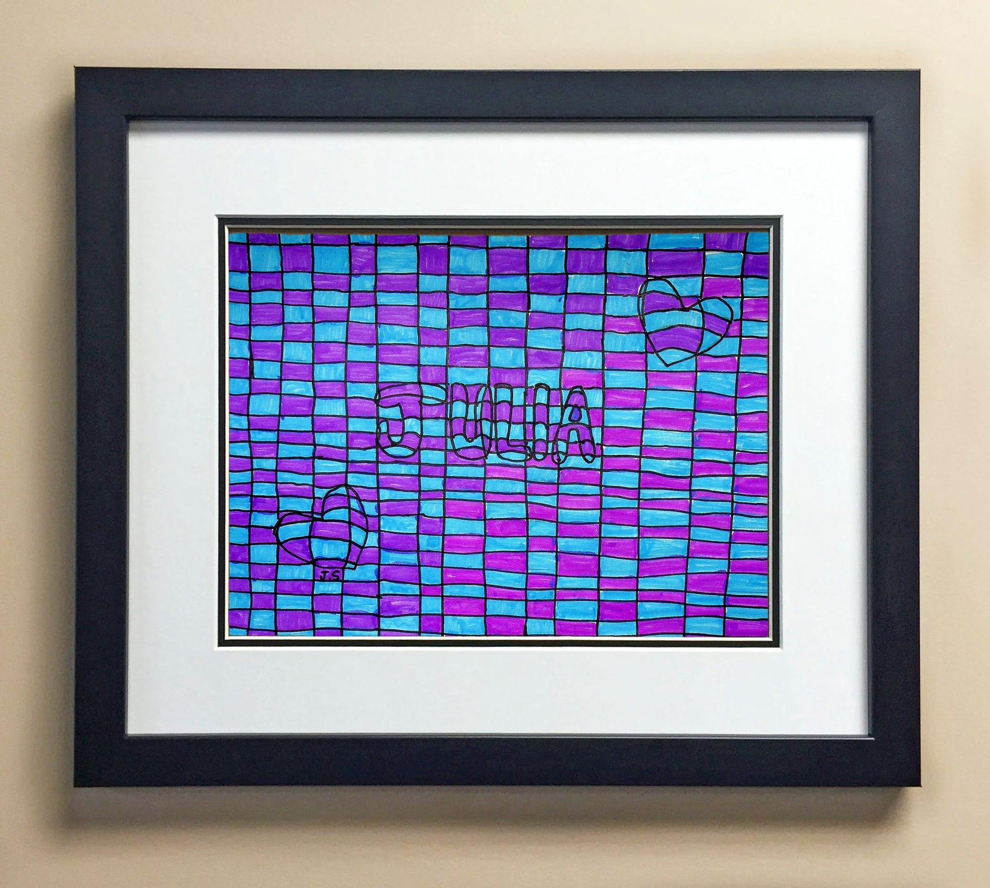 Included with the purchase is the Students Artwork, Frame, double matboard, shatter proof plexiglass, and a ready to hang backerboard with turnbuttons