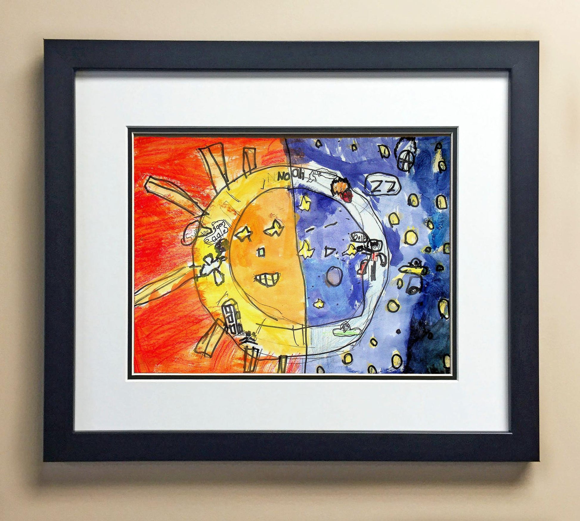Included with the purchase is the Students Artwork, Frame, double matboard, shatter proof plexiglass, and a ready to hang backerboard with turnbuttons