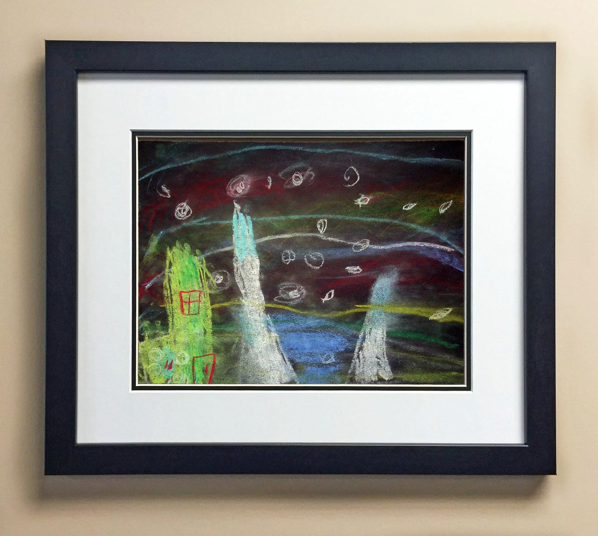 Included with the purchase is the Students Artwork, Frame, double matboard, shatter proof plexiglass, and a ready to hang backerboard with turnbuttons
