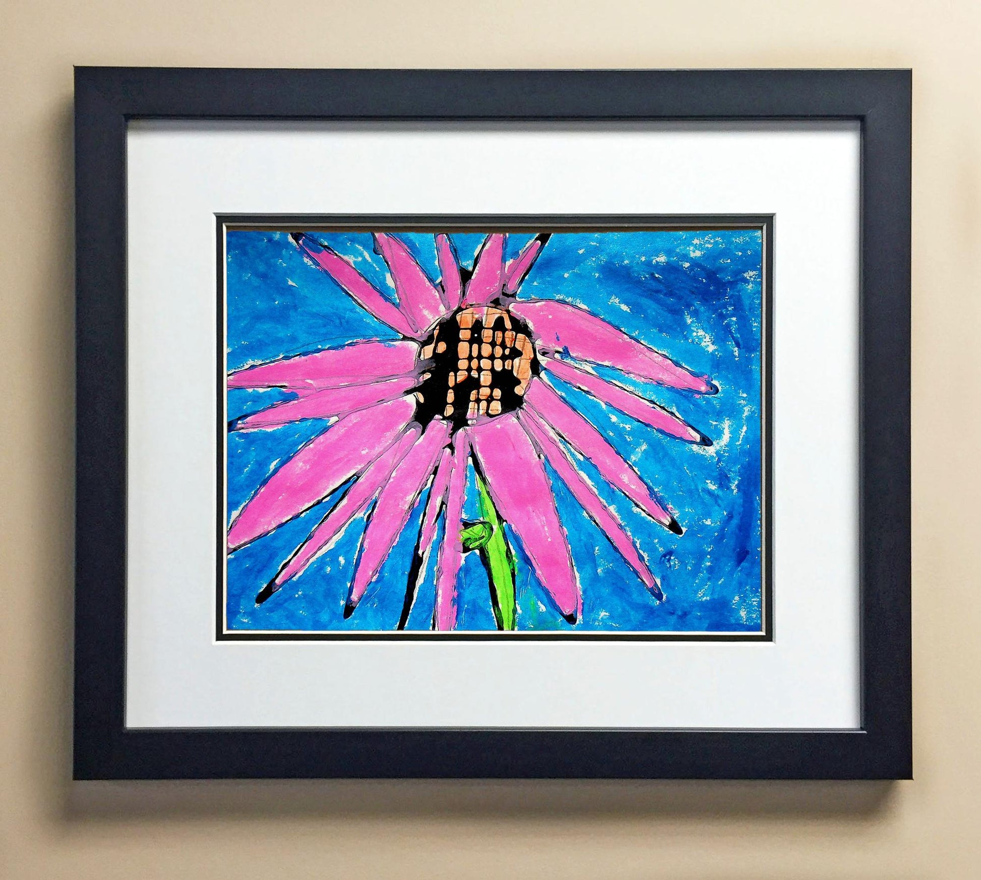 Included with the purchase is the Students Artwork, Frame, double matboard, shatter proof plexiglass, and a ready to hang backerboard with turnbuttons