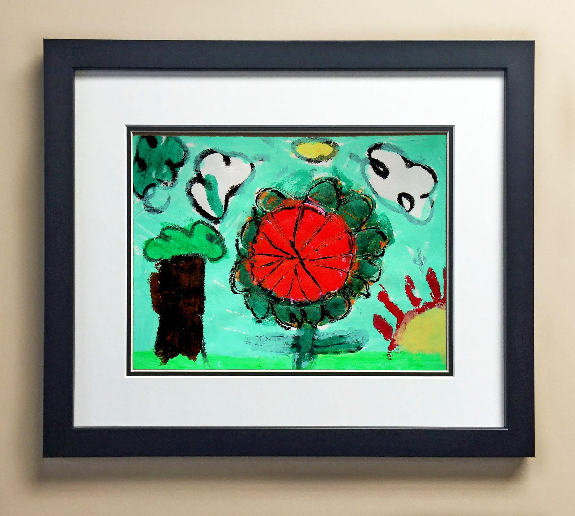 Included with the purchase is the Students Artwork, Frame, double matboard, shatter proof plexiglass, and a ready to hang backerboard with turnbuttons