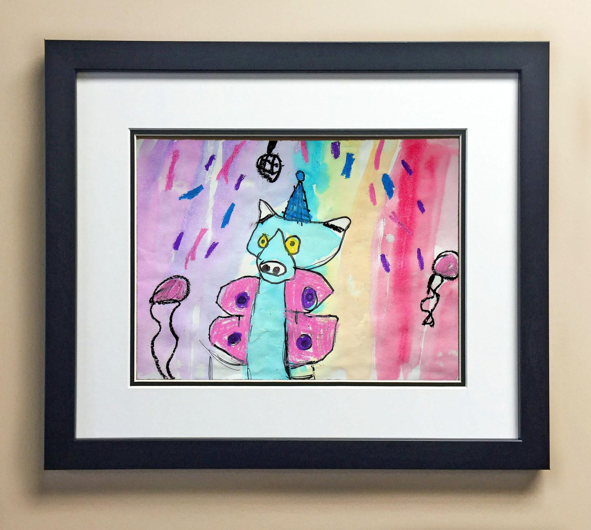 Included with the purchase is the Students Artwork, Frame, double matboard, shatter proof plexiglass, and a ready to hang backerboard with turnbuttons