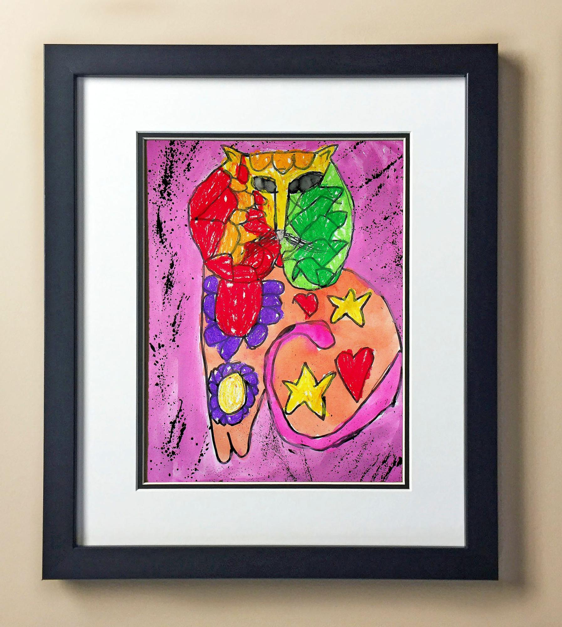 Included with the purchase is the Students Artwork, Frame, double matboard, shatter proof plexiglass, and a ready to hang backerboard with turnbuttons