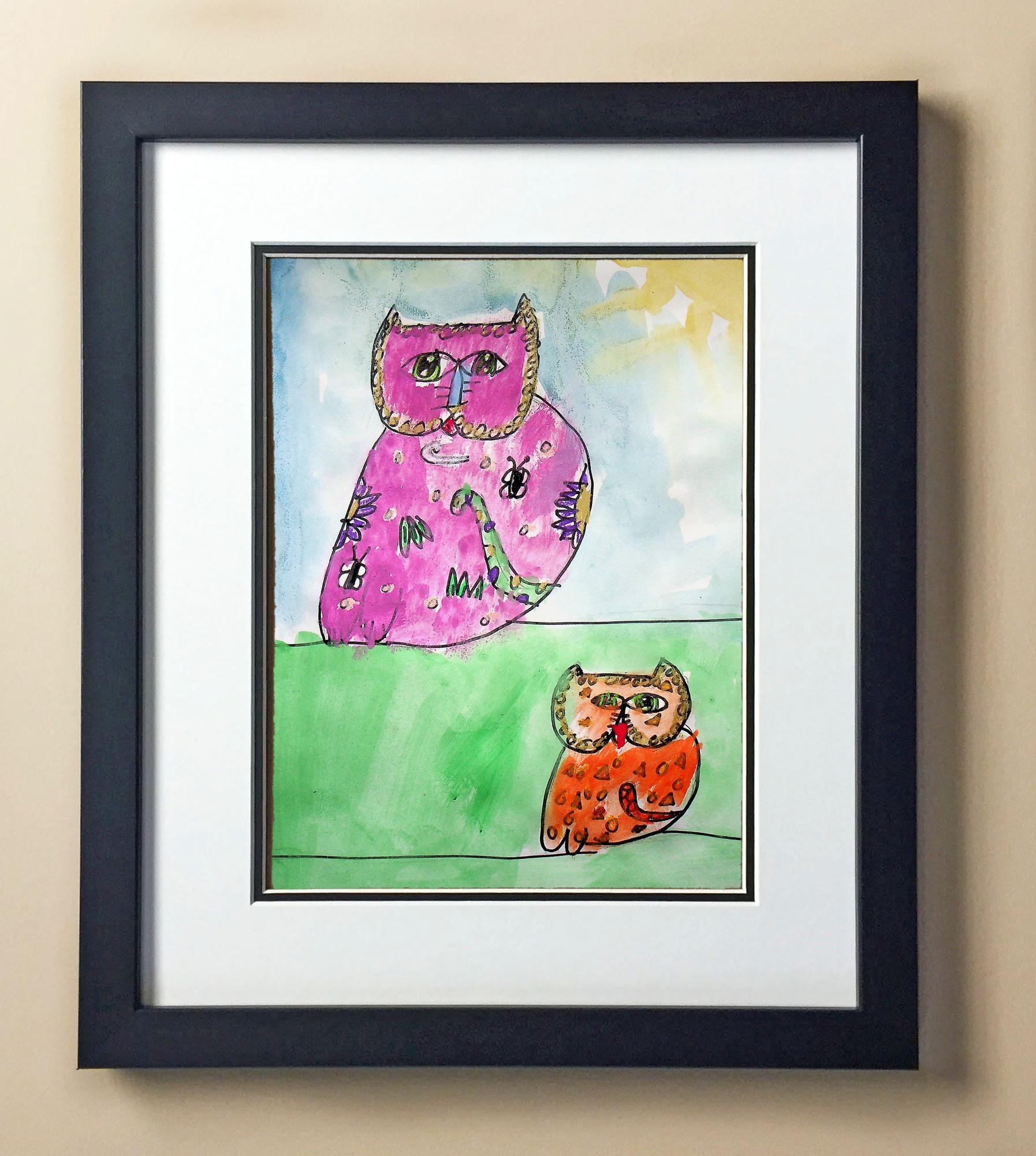 Included with the purchase is the Students Artwork, Frame, double matboard, shatter proof plexiglass, and a ready to hang backerboard with turnbuttons