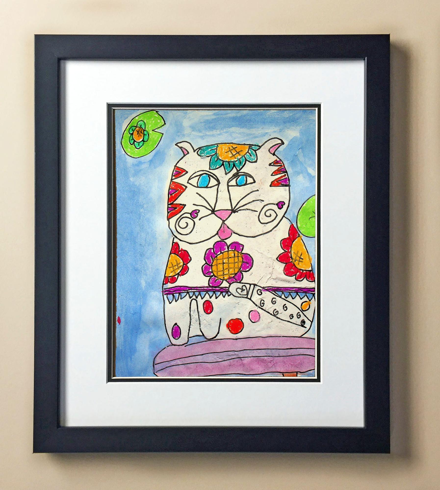 Included with the purchase is the Students Artwork, Frame, double matboard, shatter proof plexiglass, and a ready to hang backerboard with turnbuttons