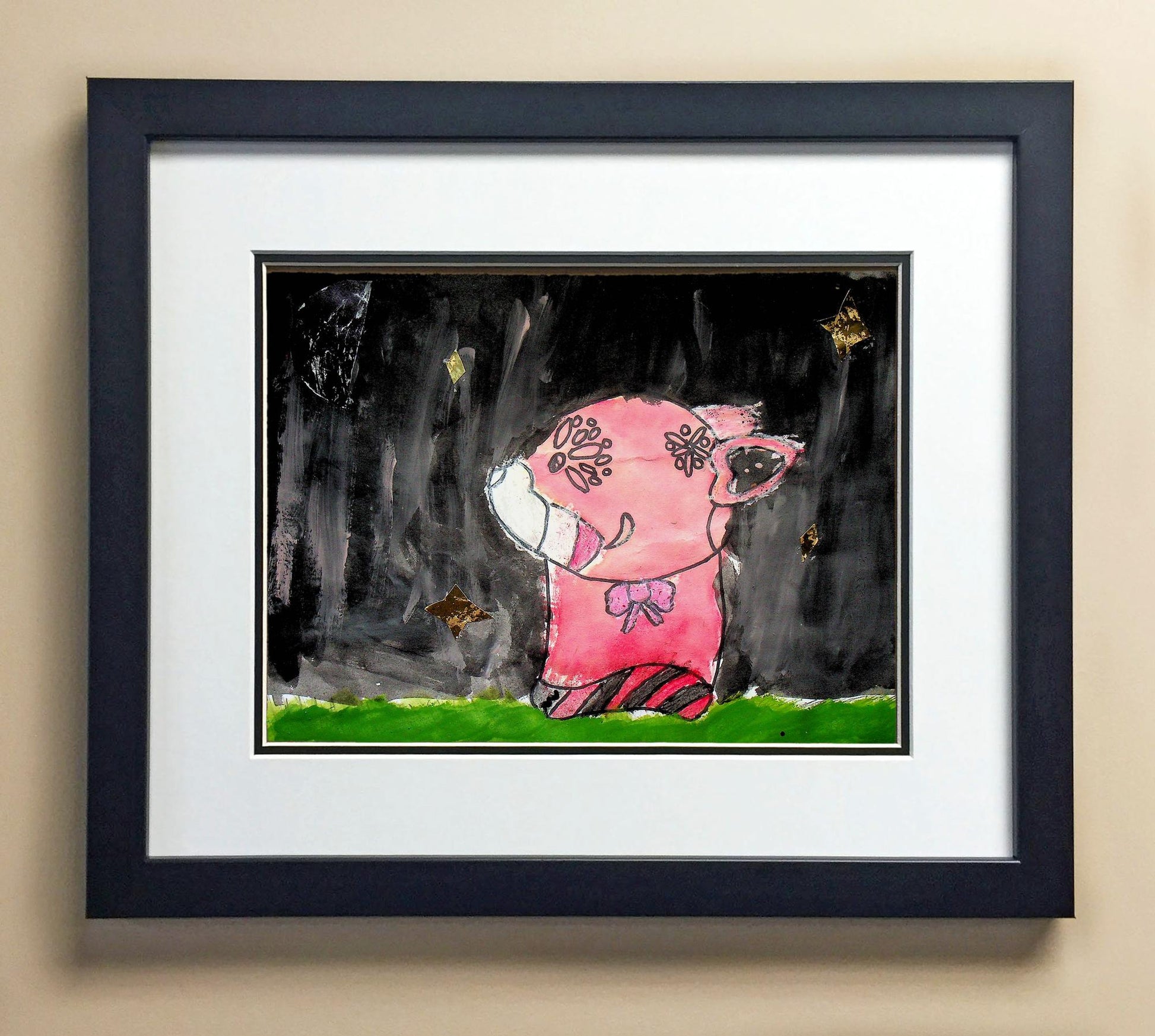 Included with the purchase is the Students Artwork, Frame, double matboard, shatter proof plexiglass, and a ready to hang backerboard with turnbuttons