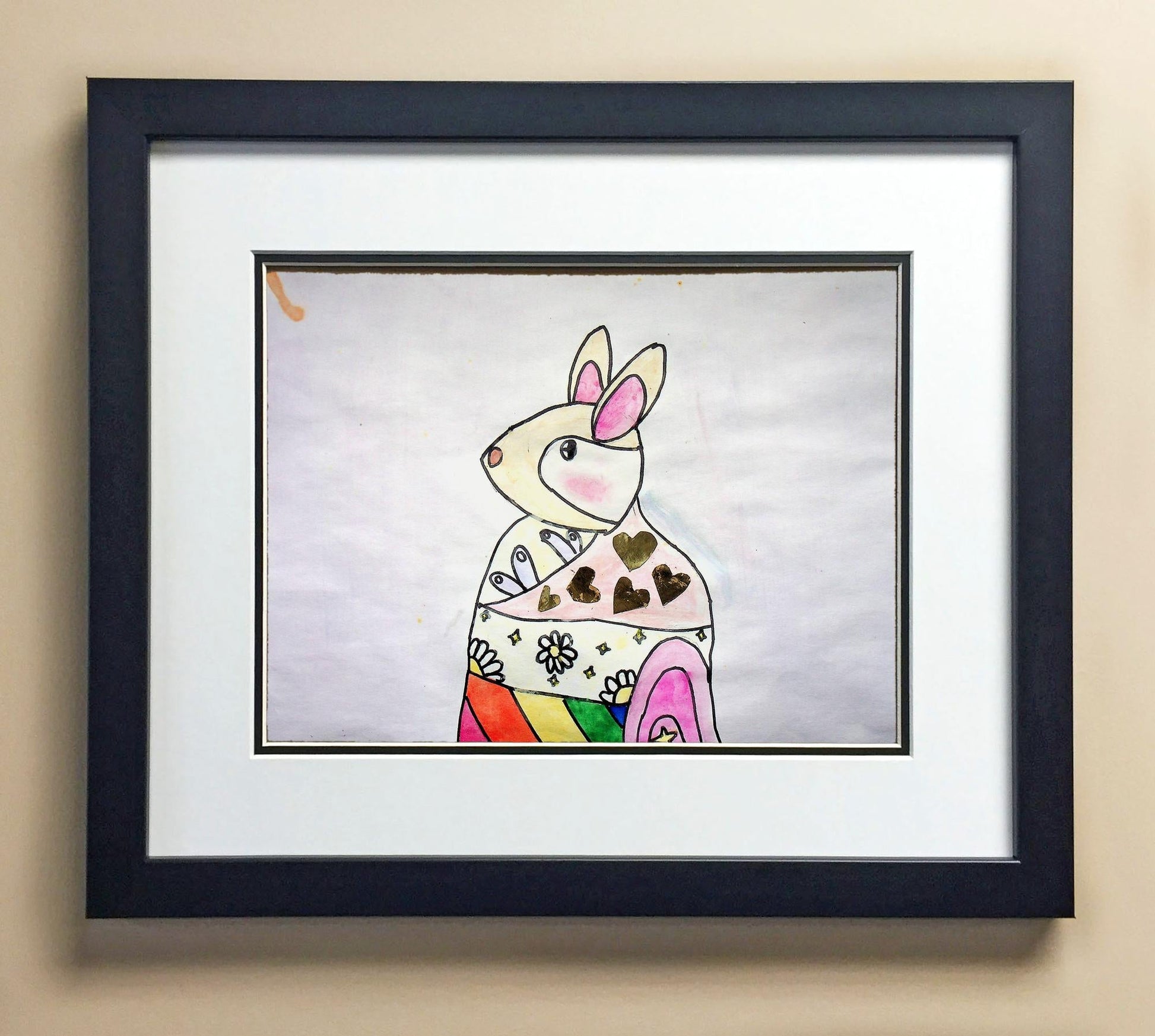 Included with the purchase is the Students Artwork, Frame, double matboard, shatter proof plexiglass, and a ready to hang backerboard with turnbuttons