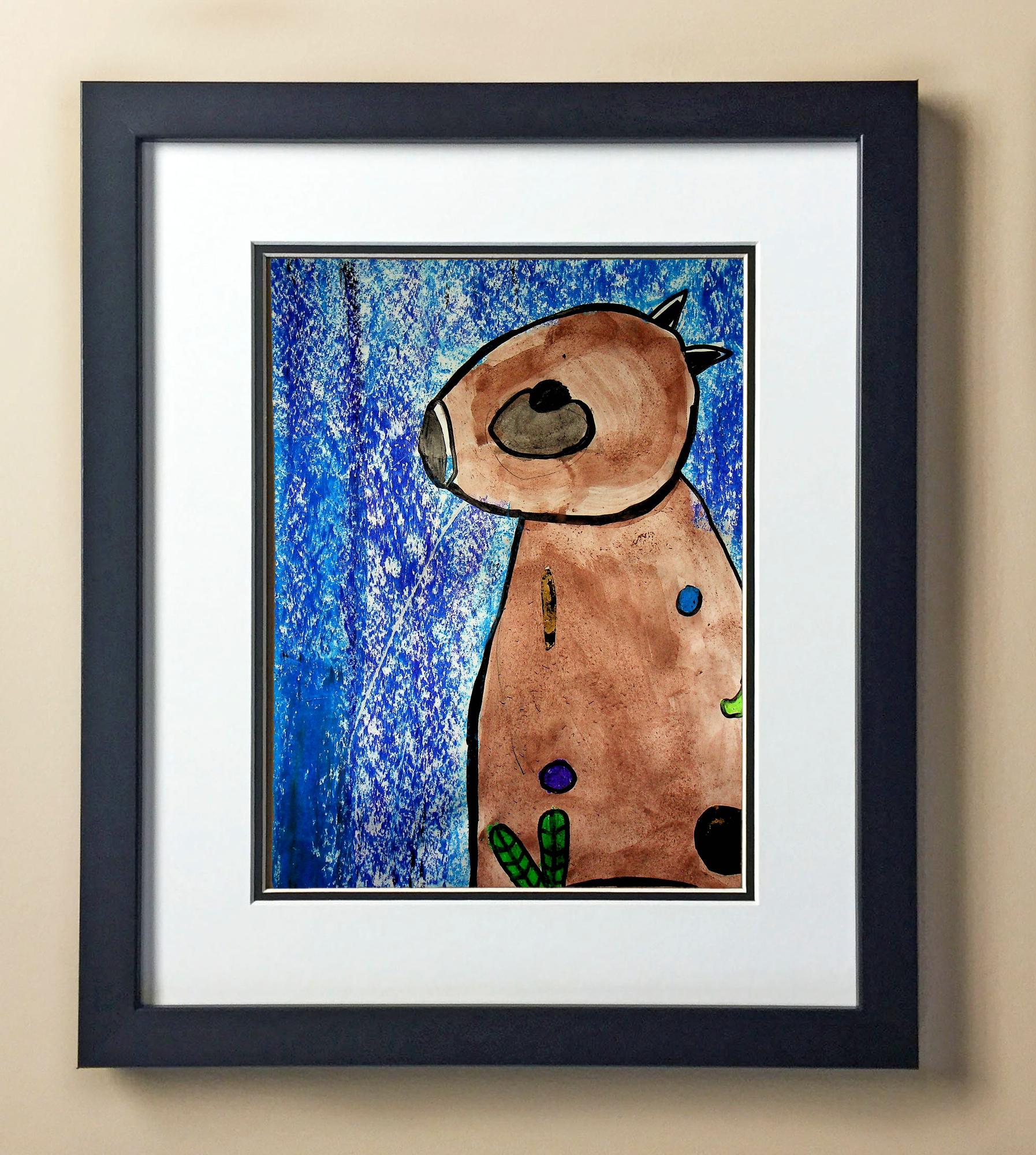 Included with the purchase is the Students Artwork, Frame, double matboard, shatter proof plexiglass, and a ready to hang backerboard with turnbuttons