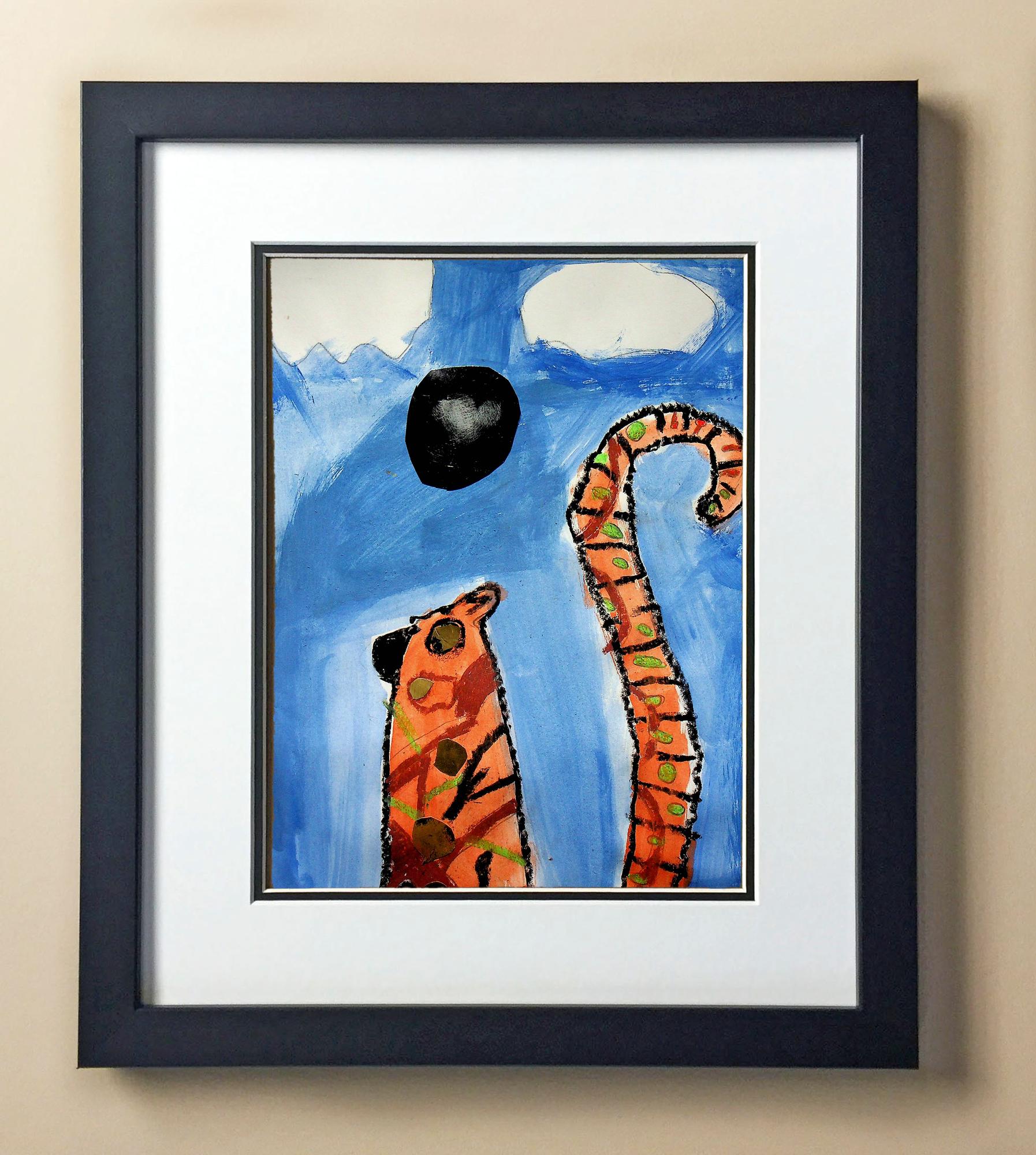 Included with the purchase is the Students Artwork, Frame, double matboard, shatter proof plexiglass, and a ready to hang backerboard with turnbuttons