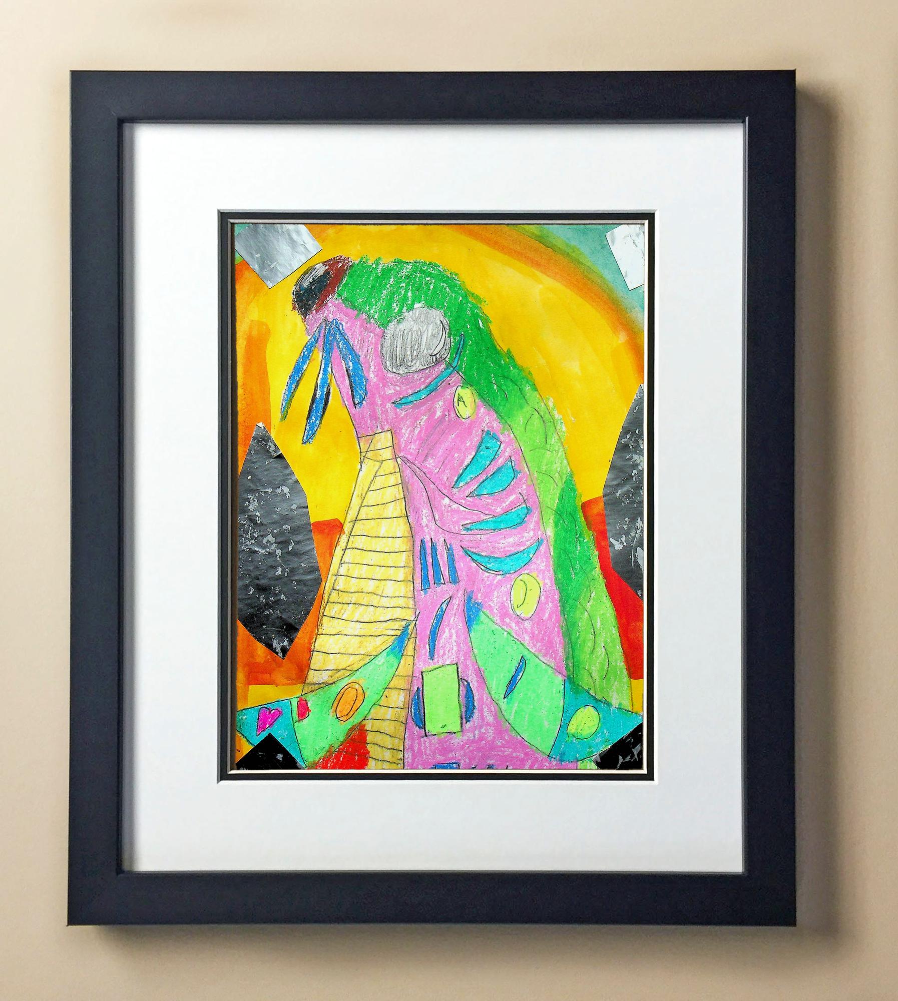 Included with the purchase is the Students Artwork, Frame, double matboard, shatter proof plexiglass, and a ready to hang backerboard with turnbuttons