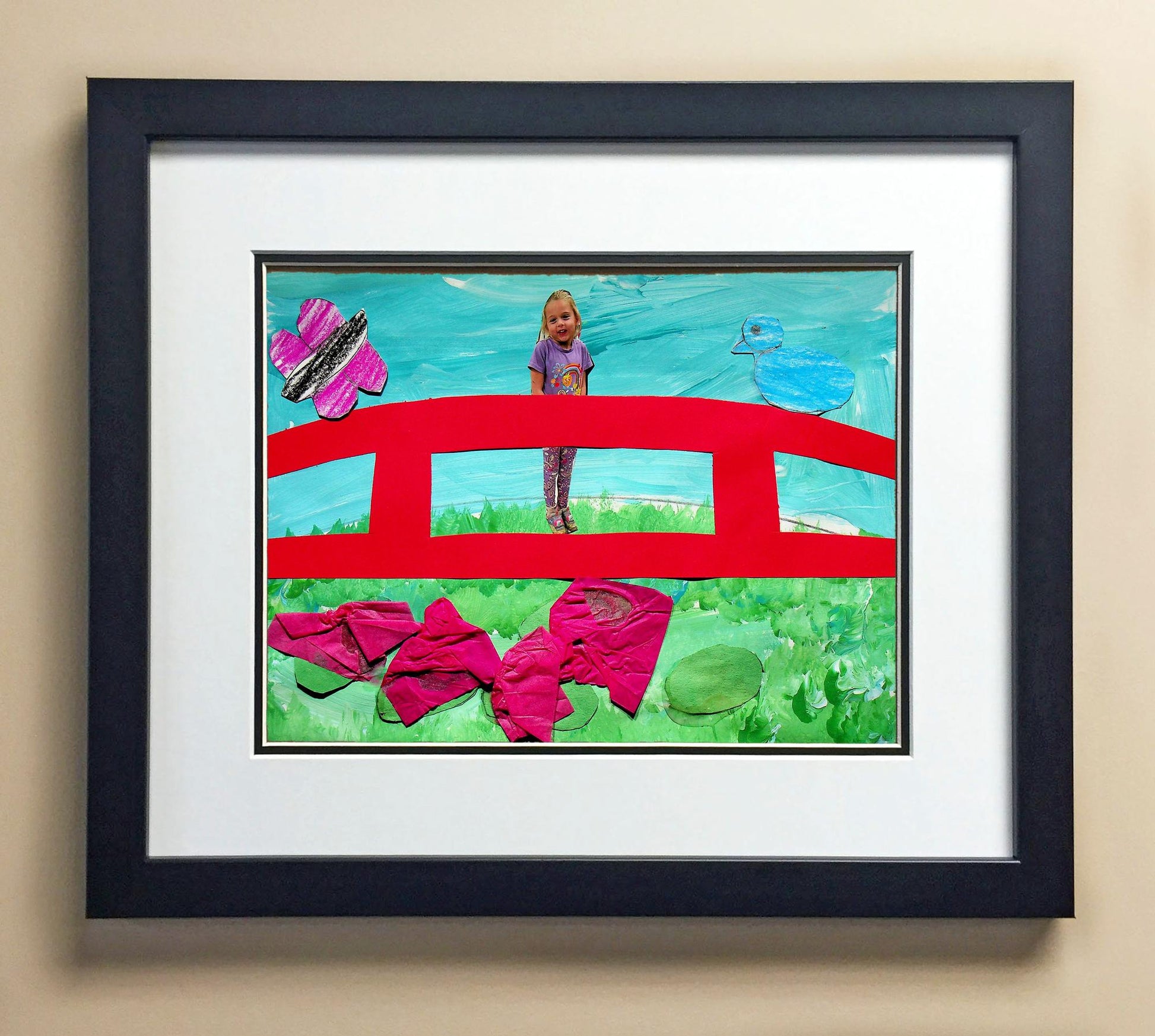 Included with the purchase is the Students Artwork, Frame, double matboard, shatter proof plexiglass, and a ready to hang backerboard with turnbuttons