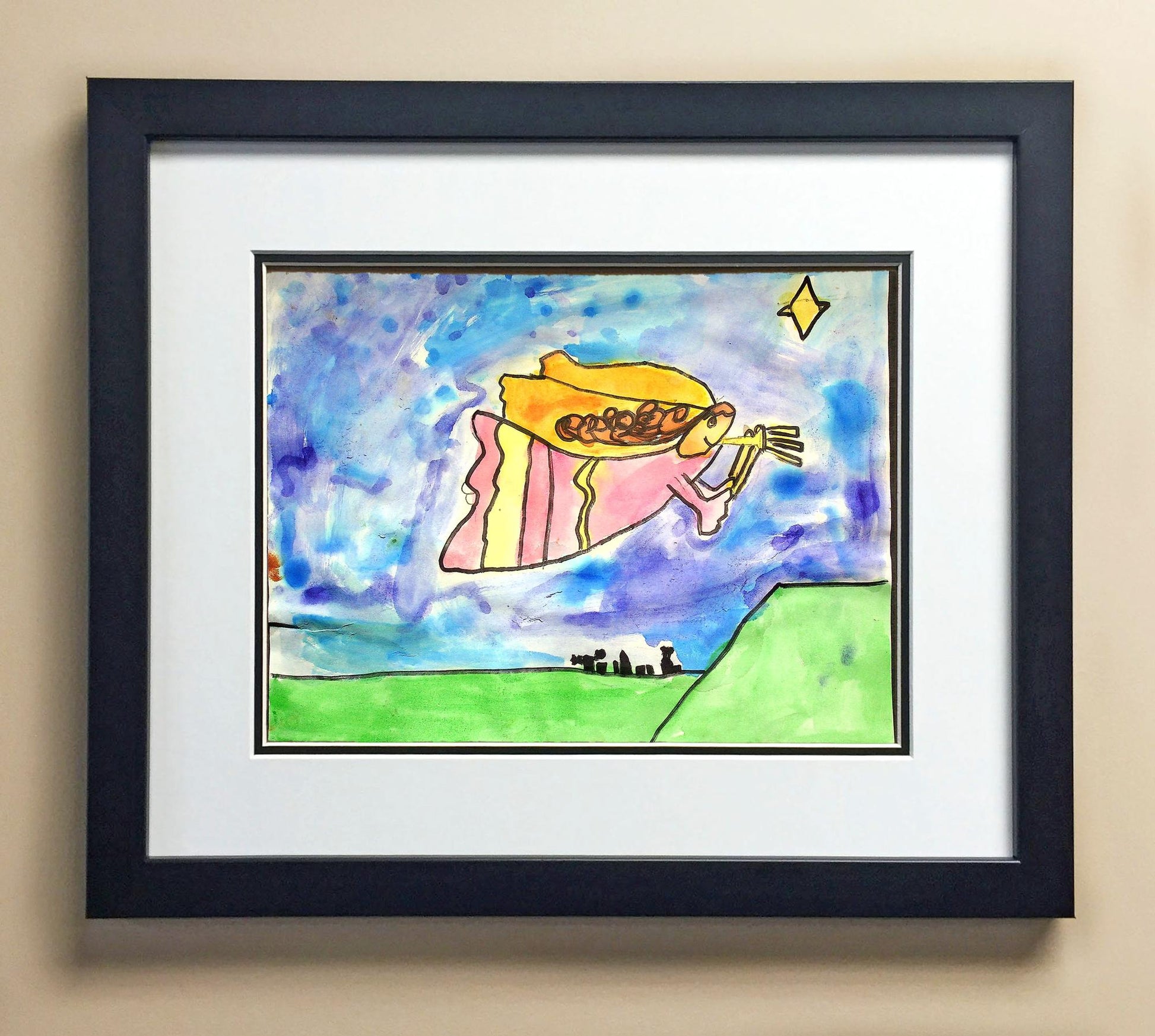 Included with the purchase is the Students Artwork, Frame, double matboard, shatter proof plexiglass, and a ready to hang backerboard with turnbuttons