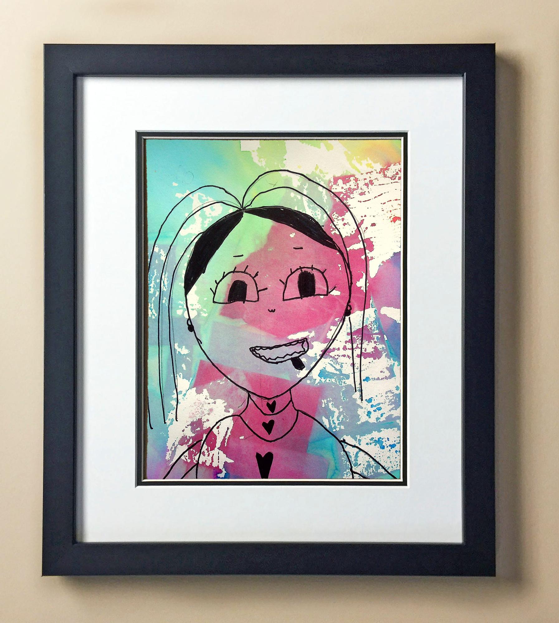 Included with the purchase is the Students Artwork, Frame, double matboard, shatter proof plexiglass, and a ready to hang backerboard with turnbuttons