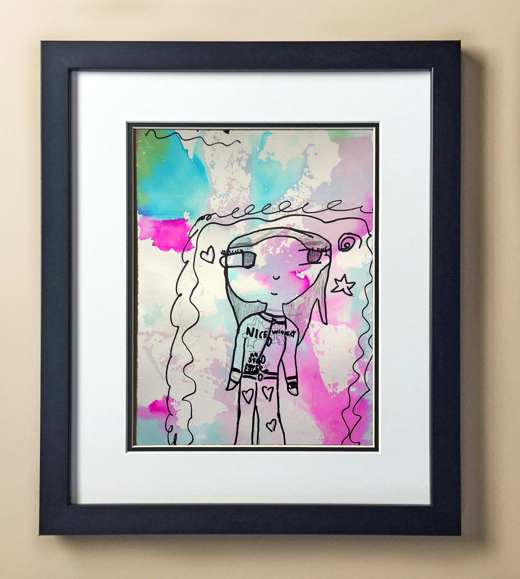 Included with the purchase is the Students Artwork, Frame, double matboard, shatter proof plexiglass, and a ready to hang backerboard with turnbuttons