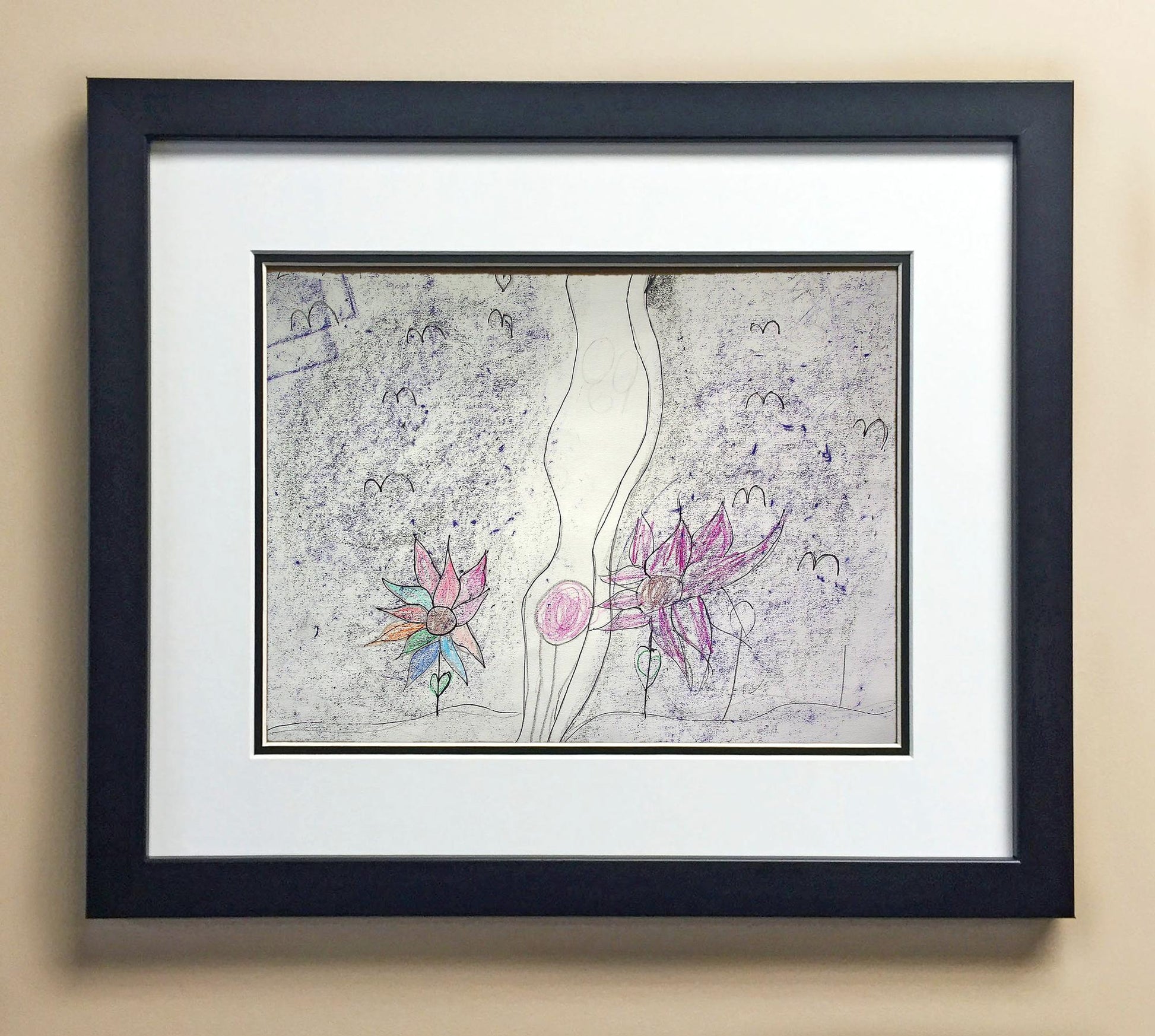Included with the purchase is the Students Artwork, Frame, double matboard, shatter proof plexiglass, and a ready to hang backerboard with turnbuttons