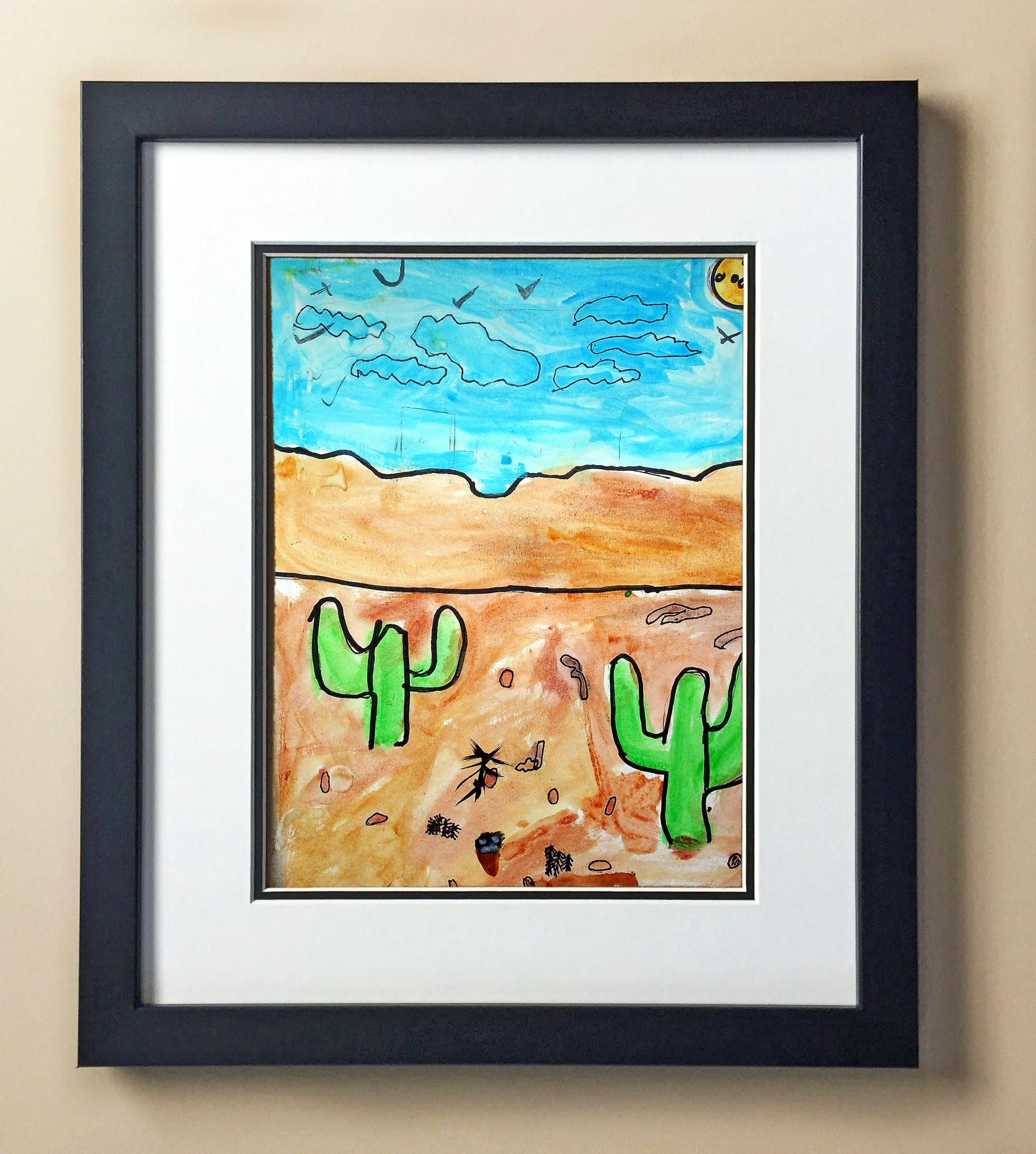 Included with the purchase is the Students Artwork, Frame, double matboard, shatter proof plexiglass, and a ready to hang backerboard with turnbuttons