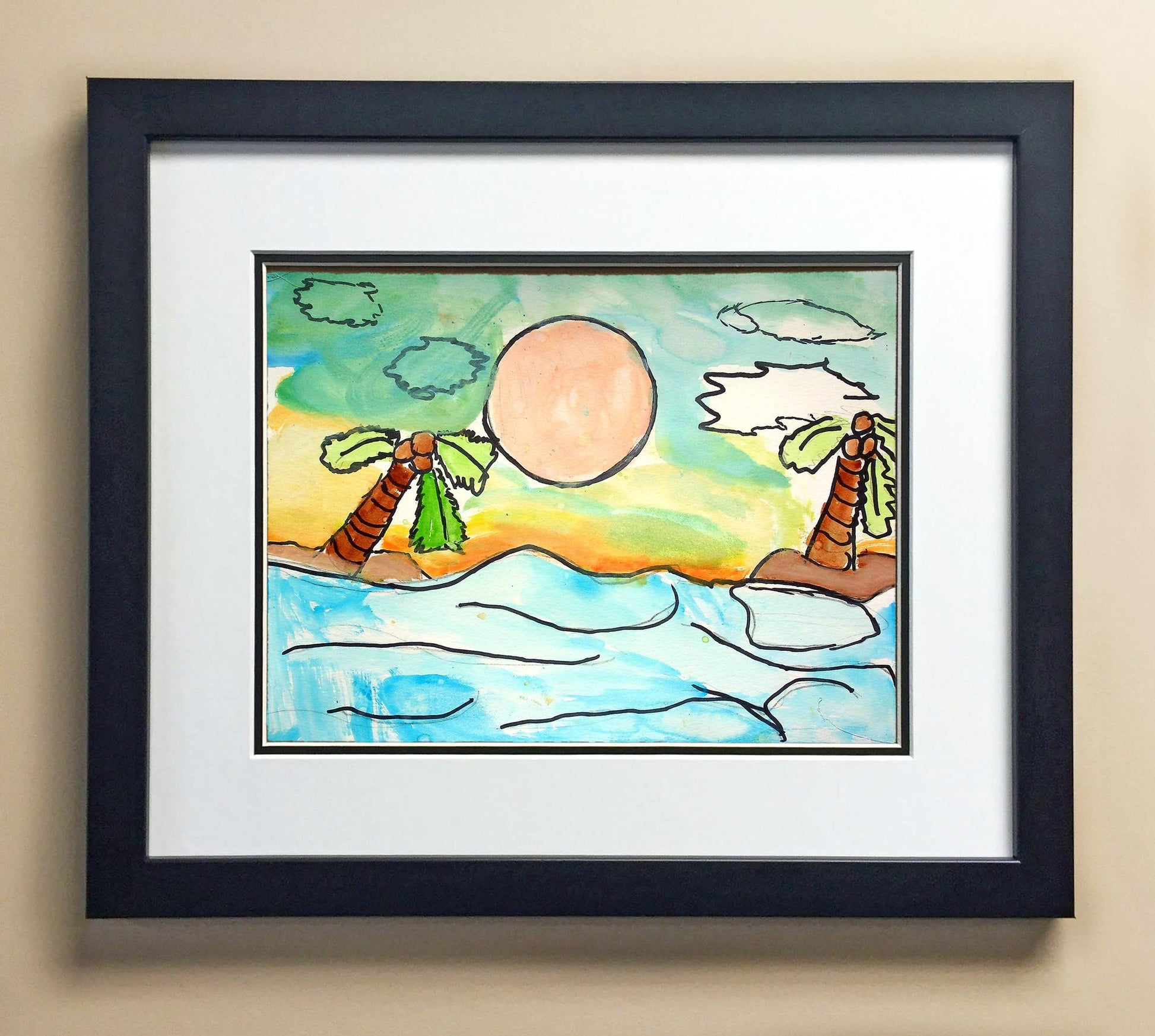 Included with the purchase is the Students Artwork, Frame, double matboard, shatter proof plexiglass, and a ready to hang backerboard with turnbuttons
