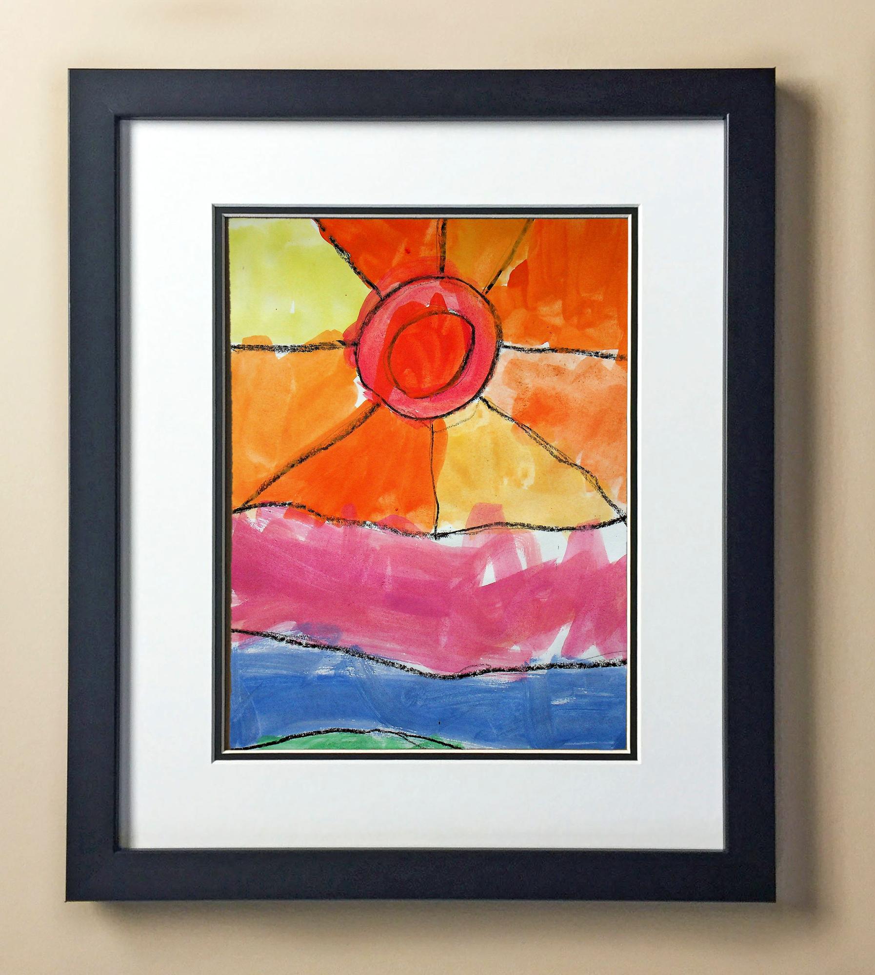 Included with the purchase is the Students Artwork, Frame, double matboard, shatter proof plexiglass, and a ready to hang backerboard with turnbuttons