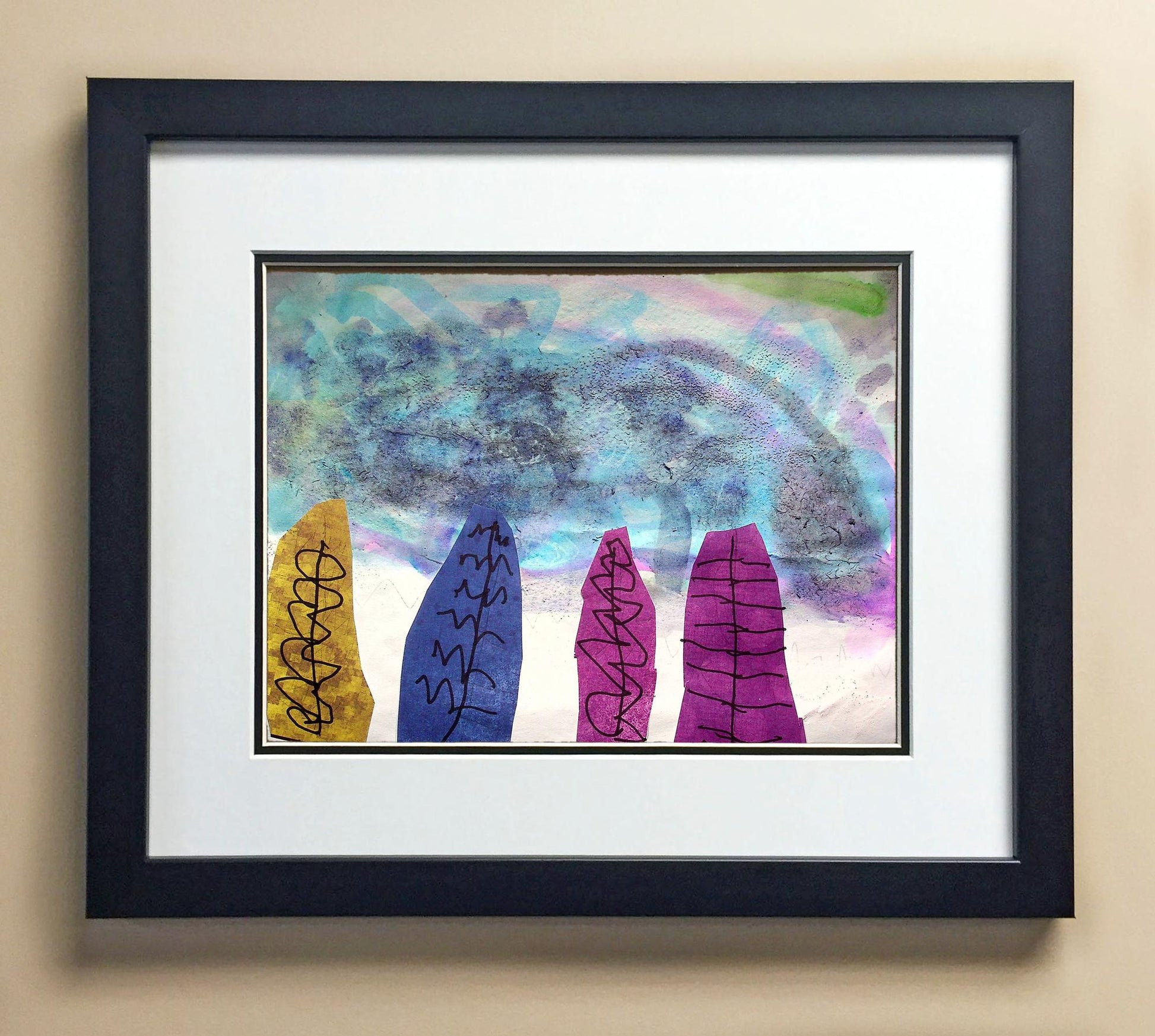 Included with the purchase is the Students Artwork, Frame, double matboard, shatter proof plexiglass, and a ready to hang backerboard with turnbuttons
