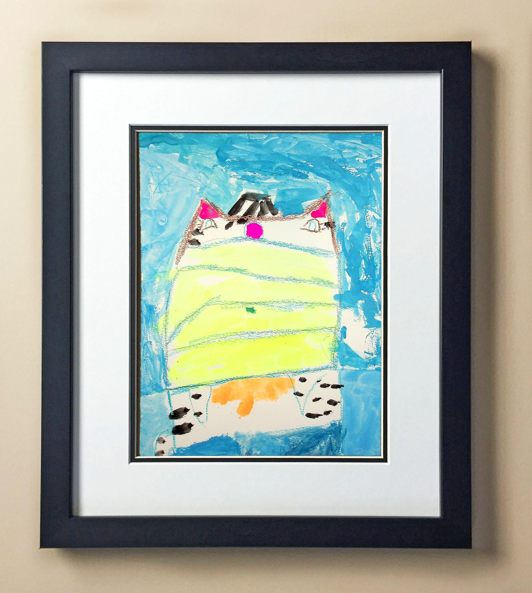 Included with the purchase is the Students Artwork, Frame, double matboard, shatter proof plexiglass, and a ready to hang backerboard with turnbuttons