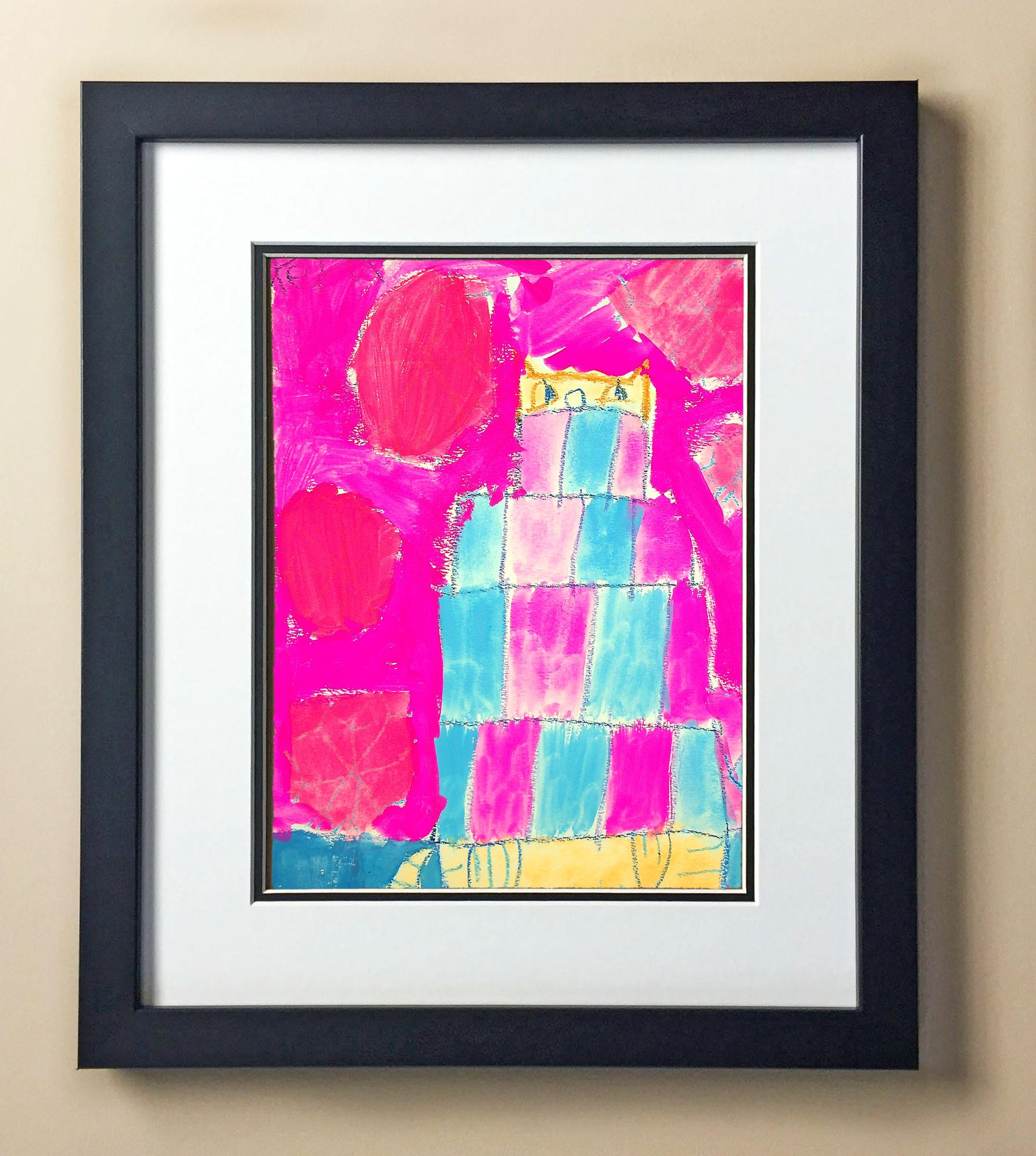 Included with the purchase is the Students Artwork, Frame, double matboard, shatter proof plexiglass, and a ready to hang backerboard with turnbuttons
