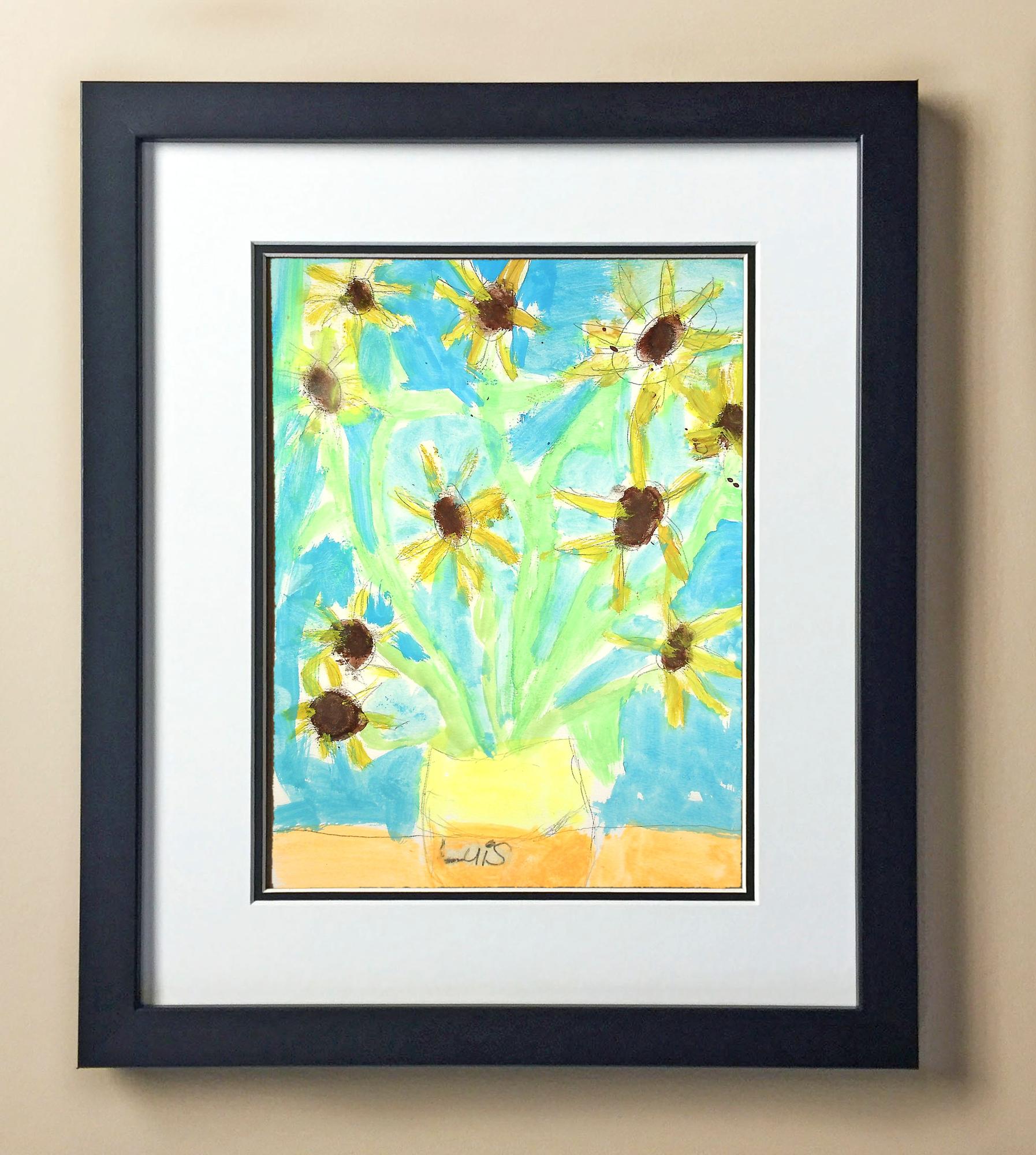 Included with the purchase is the Students Artwork, Frame, double matboard, shatter proof plexiglass, and a ready to hang backerboard with turnbuttons