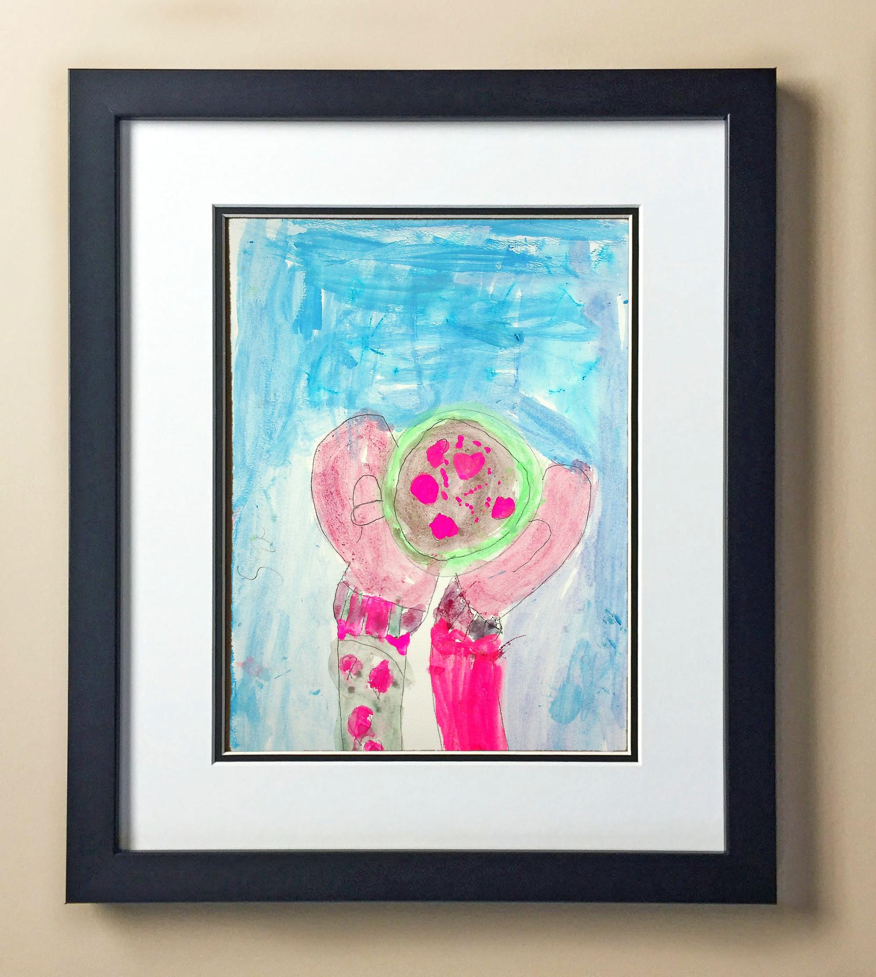 Included with the purchase is the Students Artwork, Frame, double matboard, shatter proof plexiglass, and a ready to hang backerboard with turnbuttons