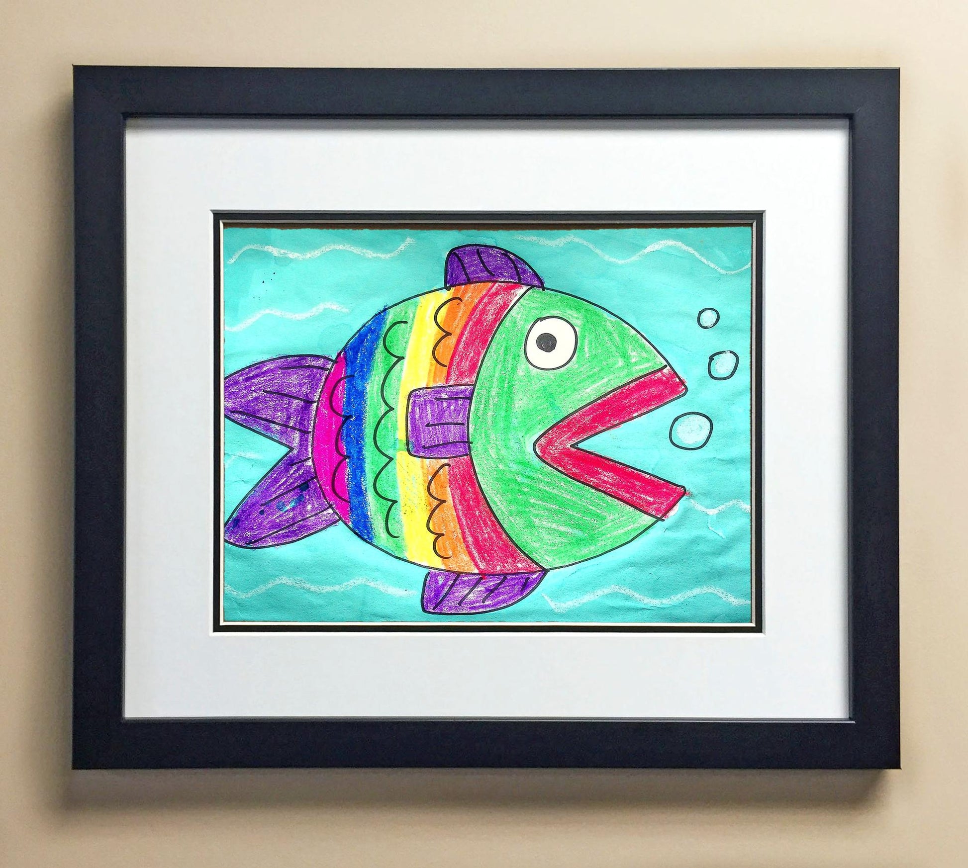 Included with the purchase is the Students Artwork, Frame, double matboard, shatter proof plexiglass, and a ready to hang backerboard with turnbuttons