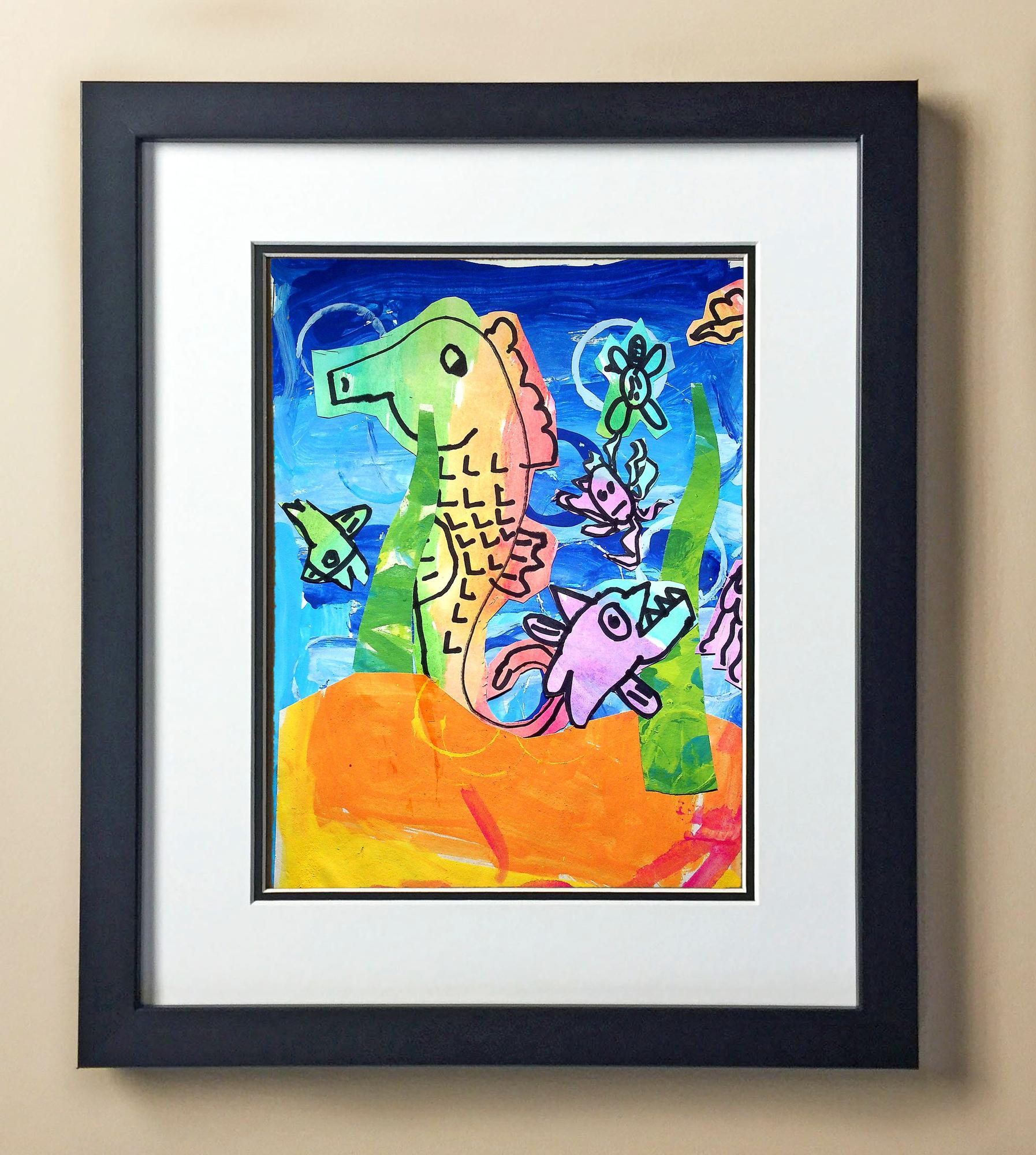 Included with the purchase is the Students Artwork, Frame, double matboard, shatter proof plexiglass, and a ready to hang backerboard with turnbuttons