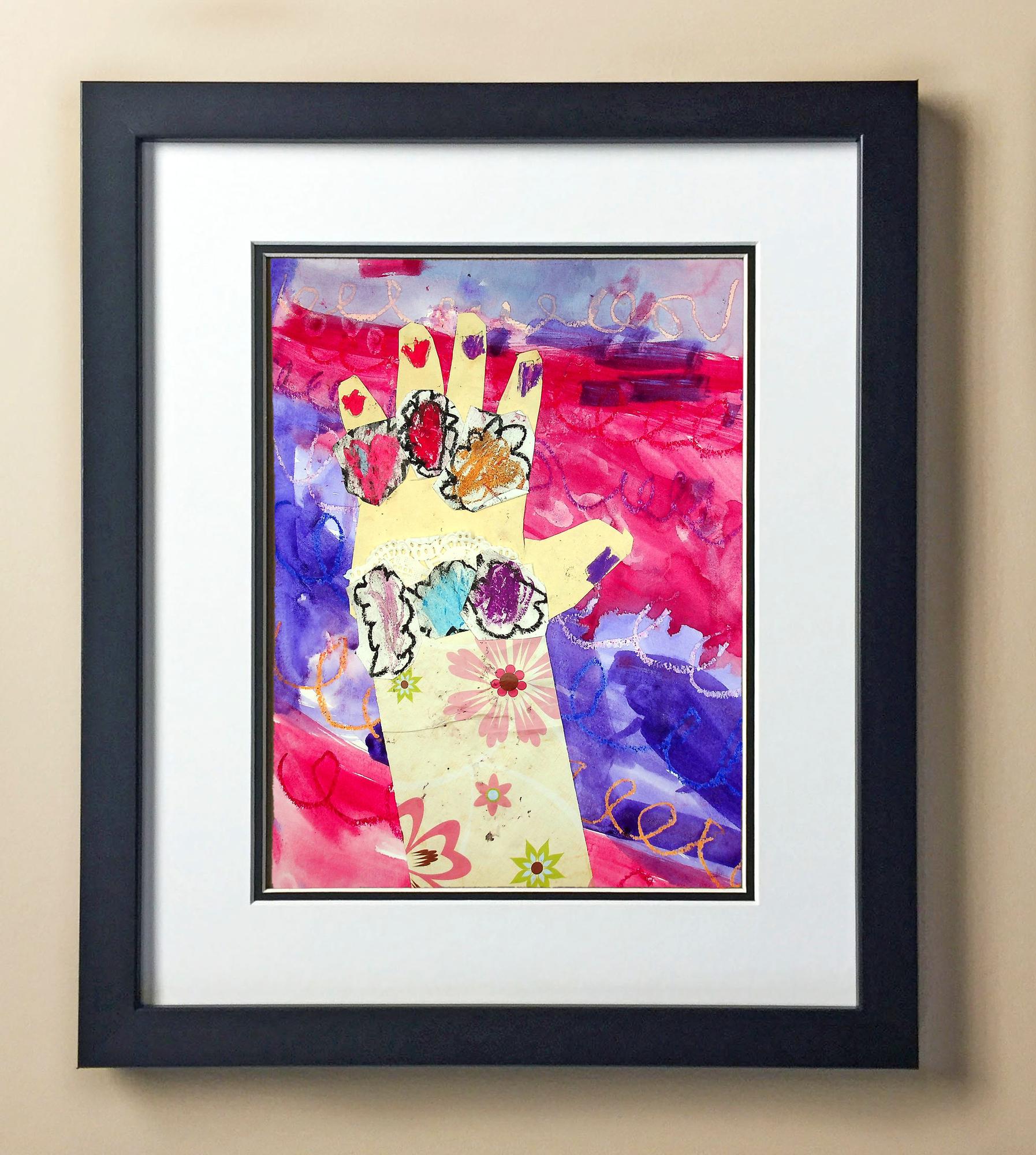 Included with the purchase is the Students Artwork, Frame, double matboard, shatter proof plexiglass, and a ready to hang backerboard with turnbuttons