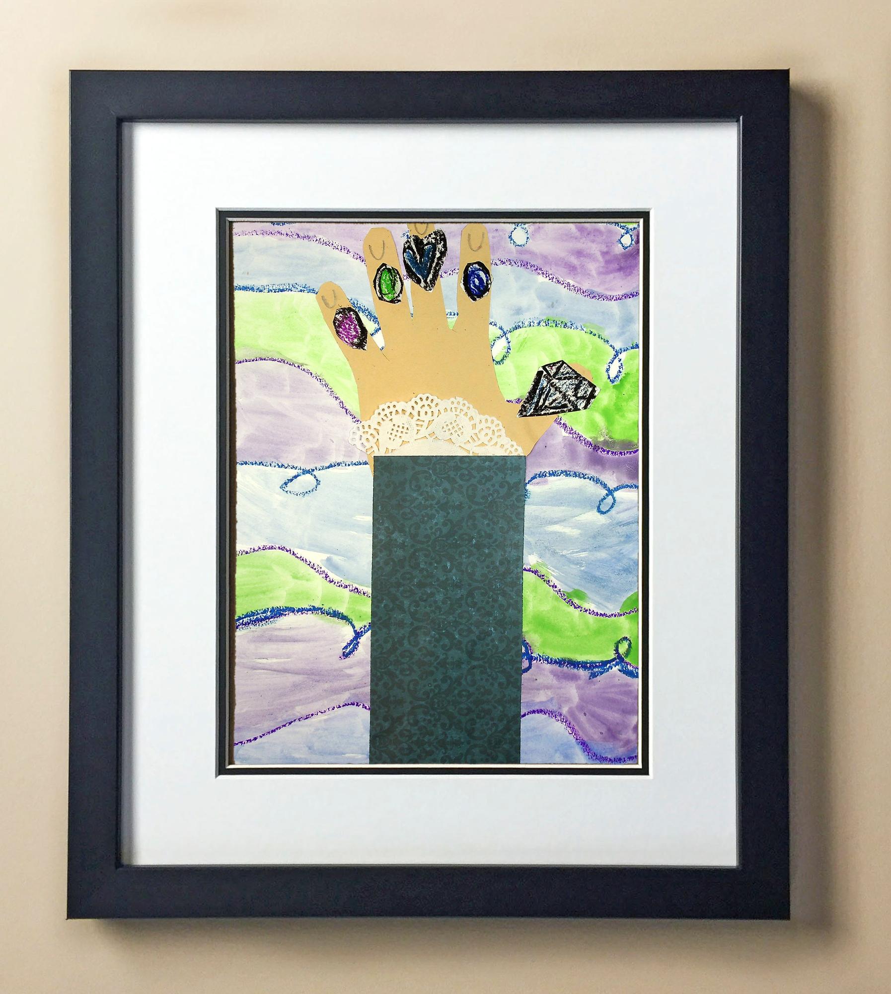 Included with the purchase is the Students Artwork, Frame, double matboard, shatter proof plexiglass, and a ready to hang backerboard with turnbuttons