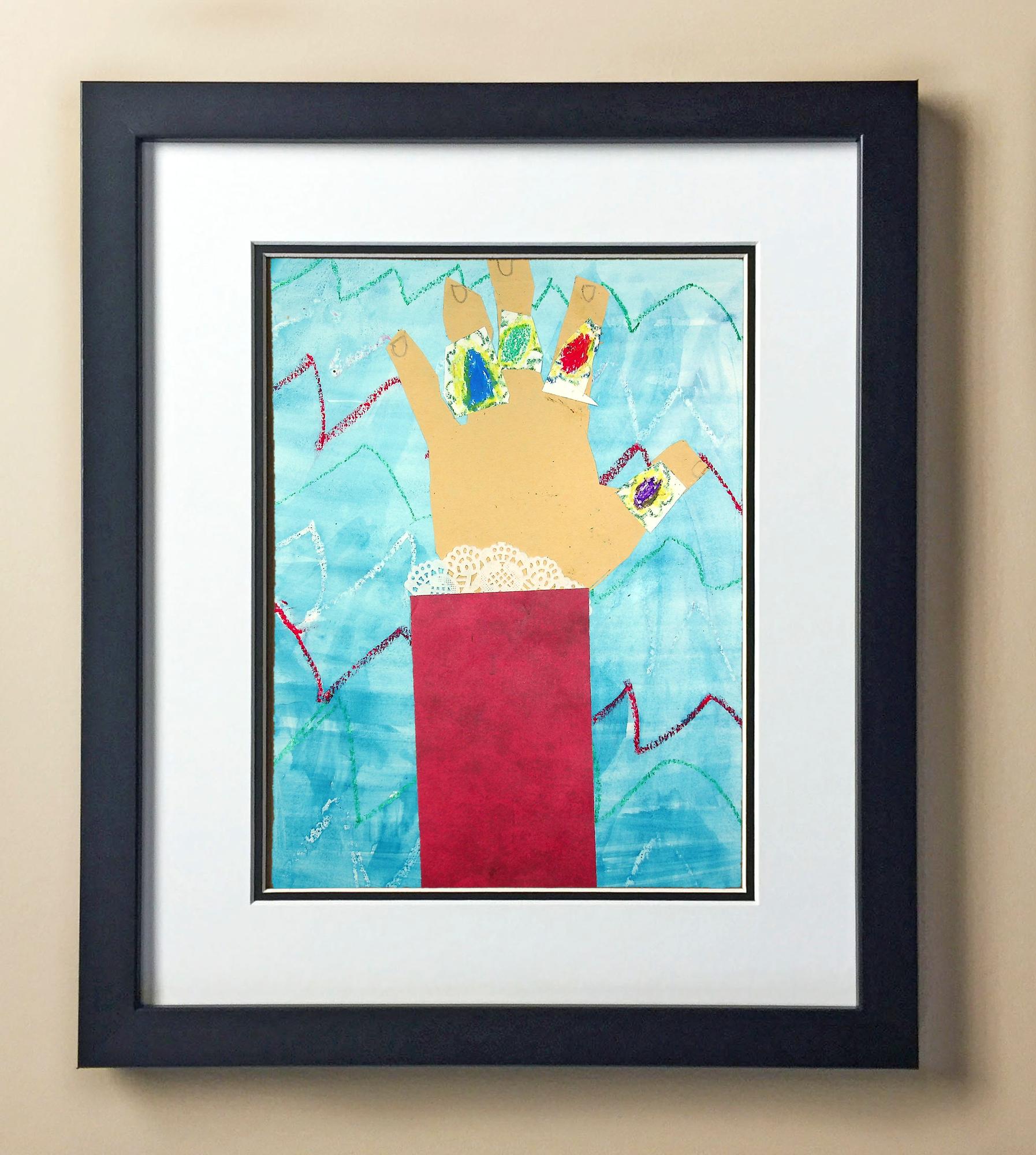 Included with the purchase is the Students Artwork, Frame, double matboard, shatter proof plexiglass, and a ready to hang backerboard with turnbuttons