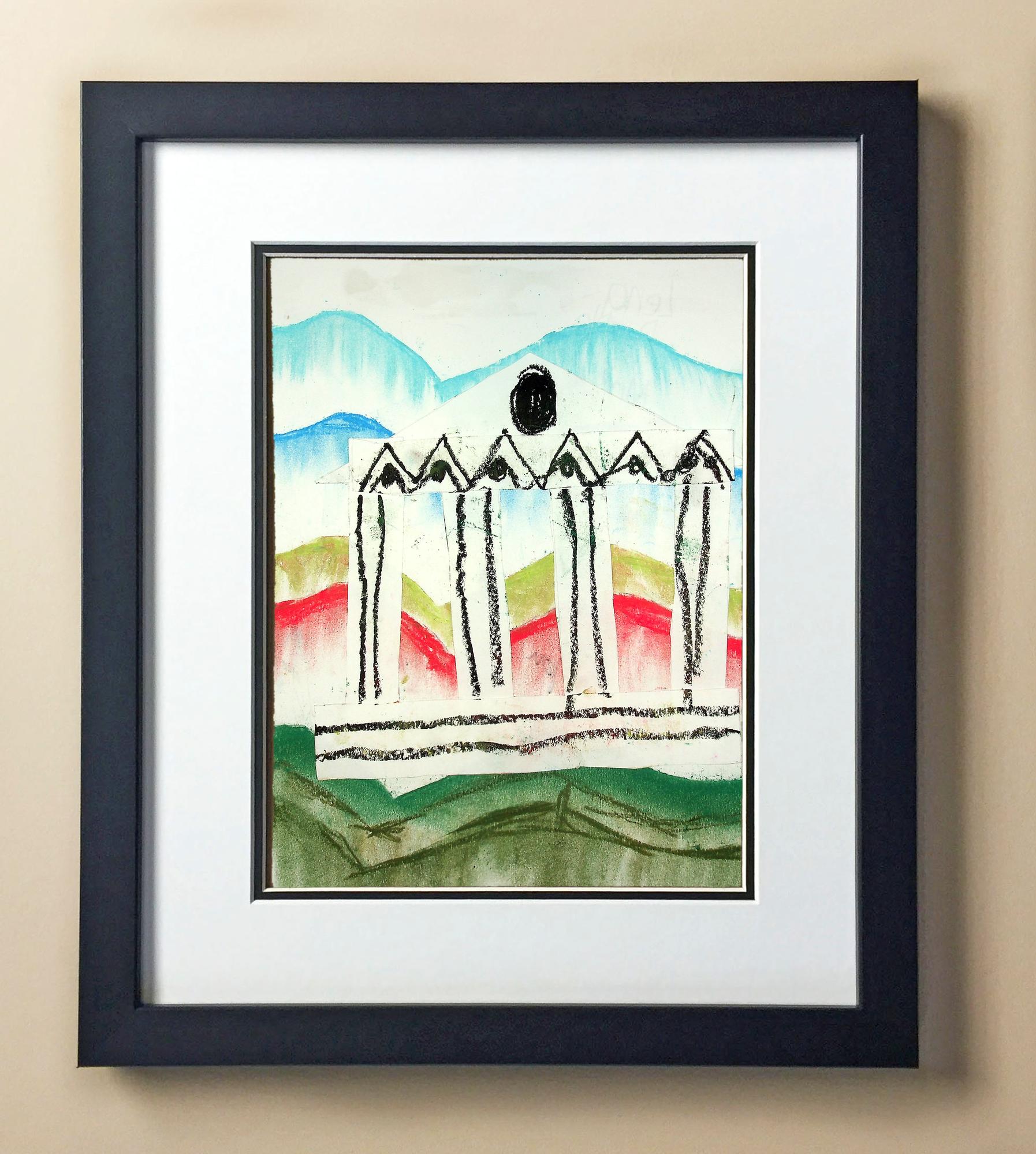 Included with the purchase is the Students Artwork, Frame, double matboard, shatter proof plexiglass, and a ready to hang backerboard with turnbuttons