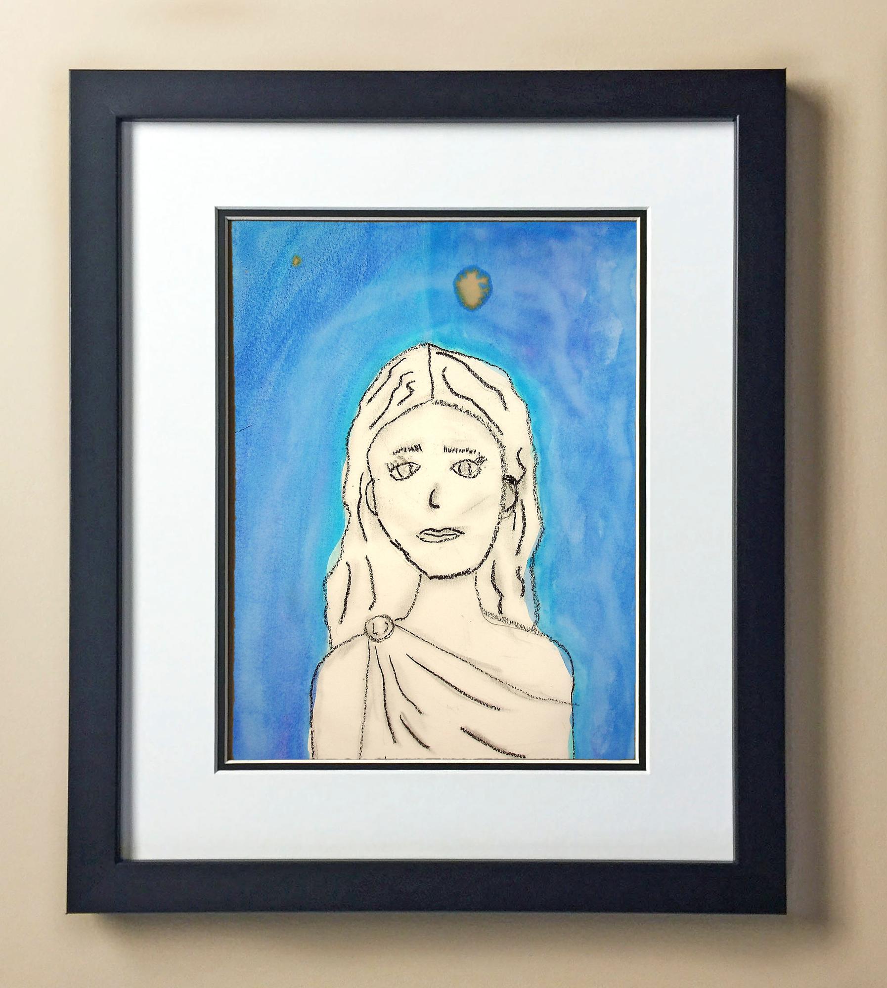 Included with the purchase is the Students Artwork, Frame, double matboard, shatter proof plexiglass, and a ready to hang backerboard with turnbuttons