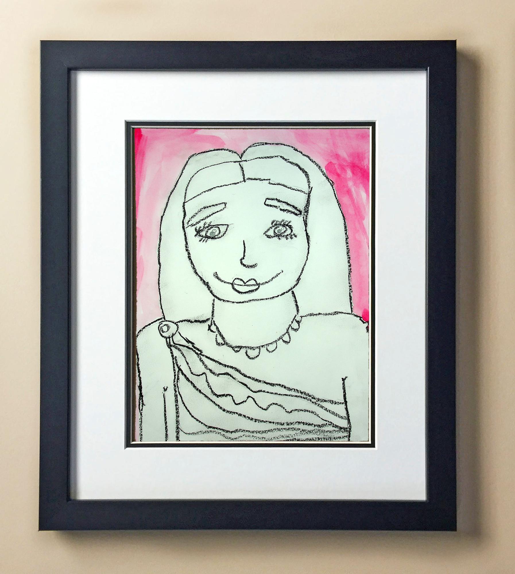 Included with the purchase is the Students Artwork, Frame, double matboard, shatter proof plexiglass, and a ready to hang backerboard with turnbuttons