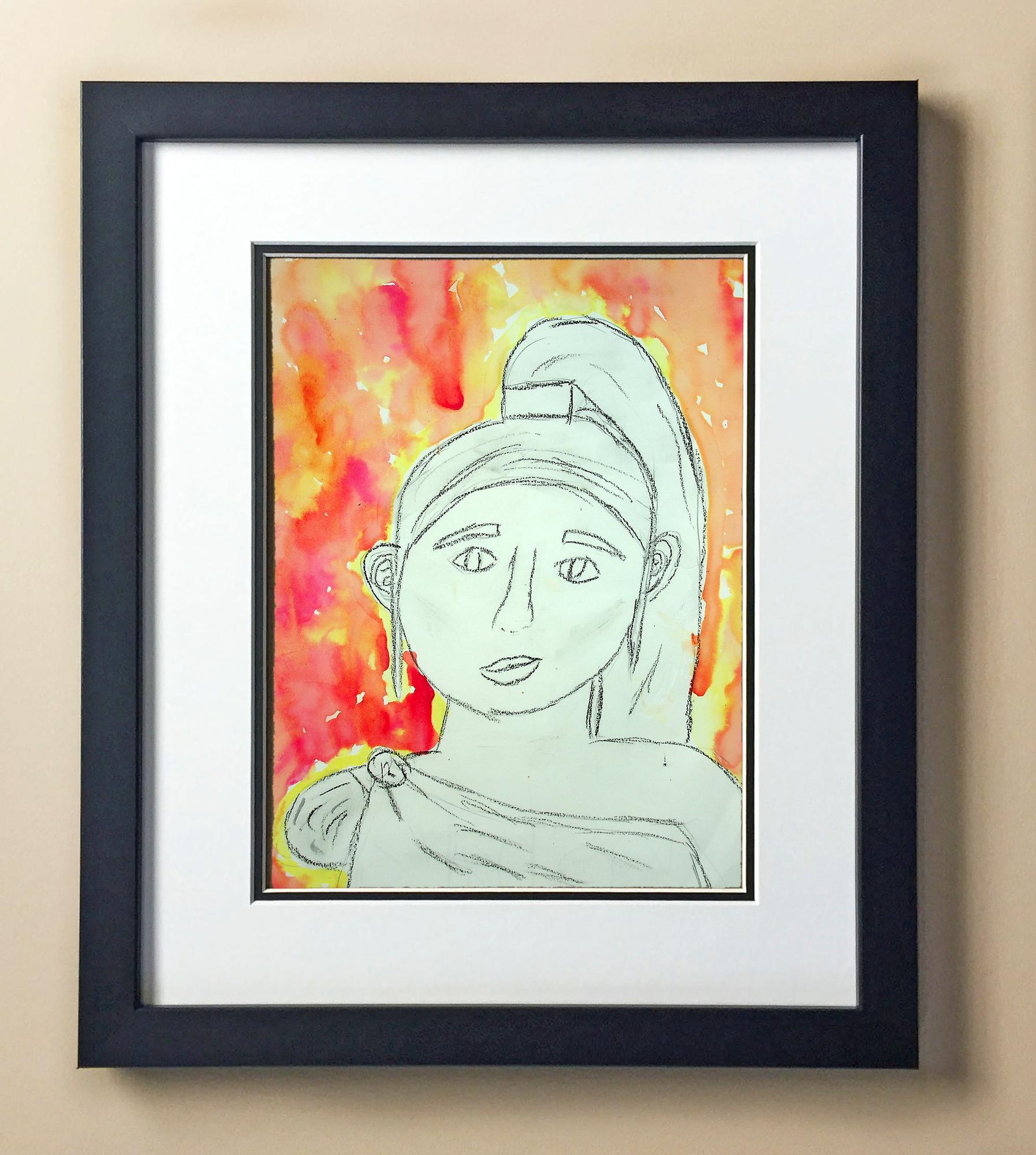 Included with the purchase is the Students Artwork, Frame, double matboard, shatter proof plexiglass, and a ready to hang backerboard with turnbuttons