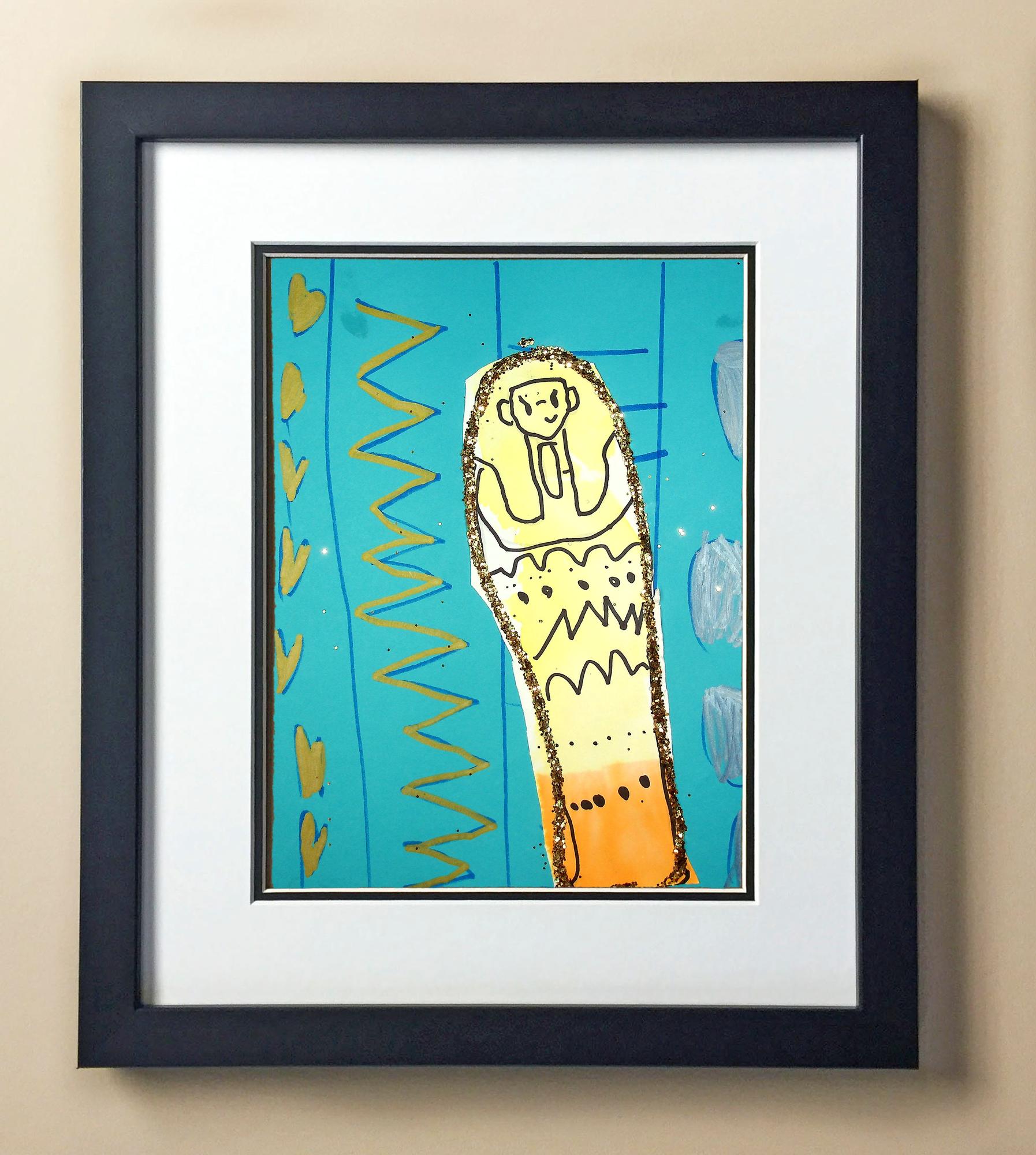 Included with the purchase is the Students Artwork, Frame, double matboard, shatter proof plexiglass, and a ready to hang backerboard with turnbuttons