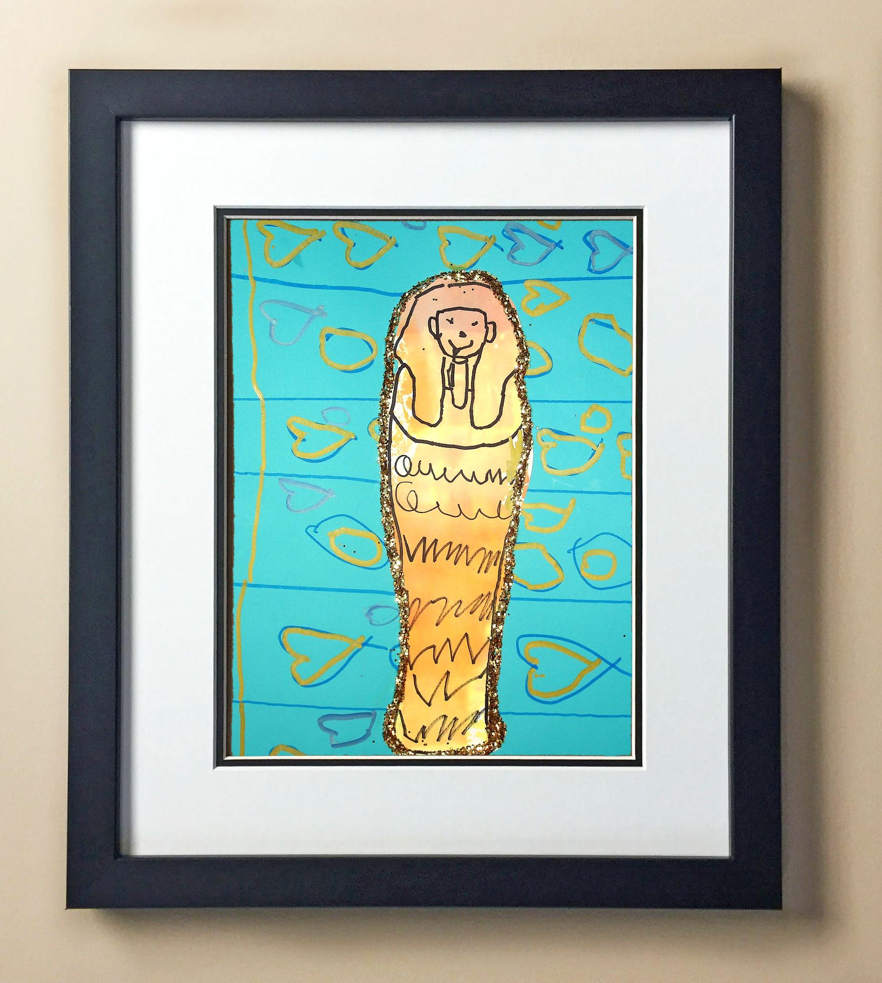 Included with the purchase is the Students Artwork, Frame, double matboard, shatter proof plexiglass, and a ready to hang backerboard with turnbuttons