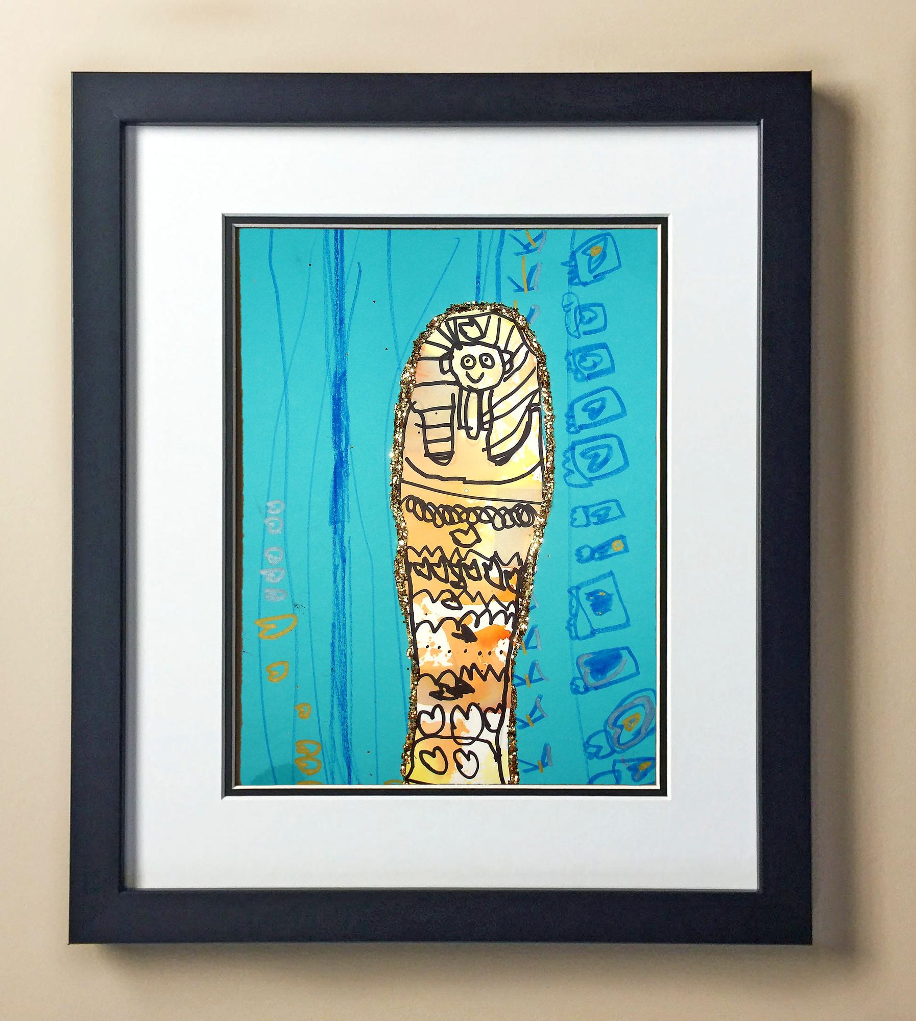 Included with the purchase is the Students Artwork, Frame, double matboard, shatter proof plexiglass, and a ready to hang backerboard with turnbuttons