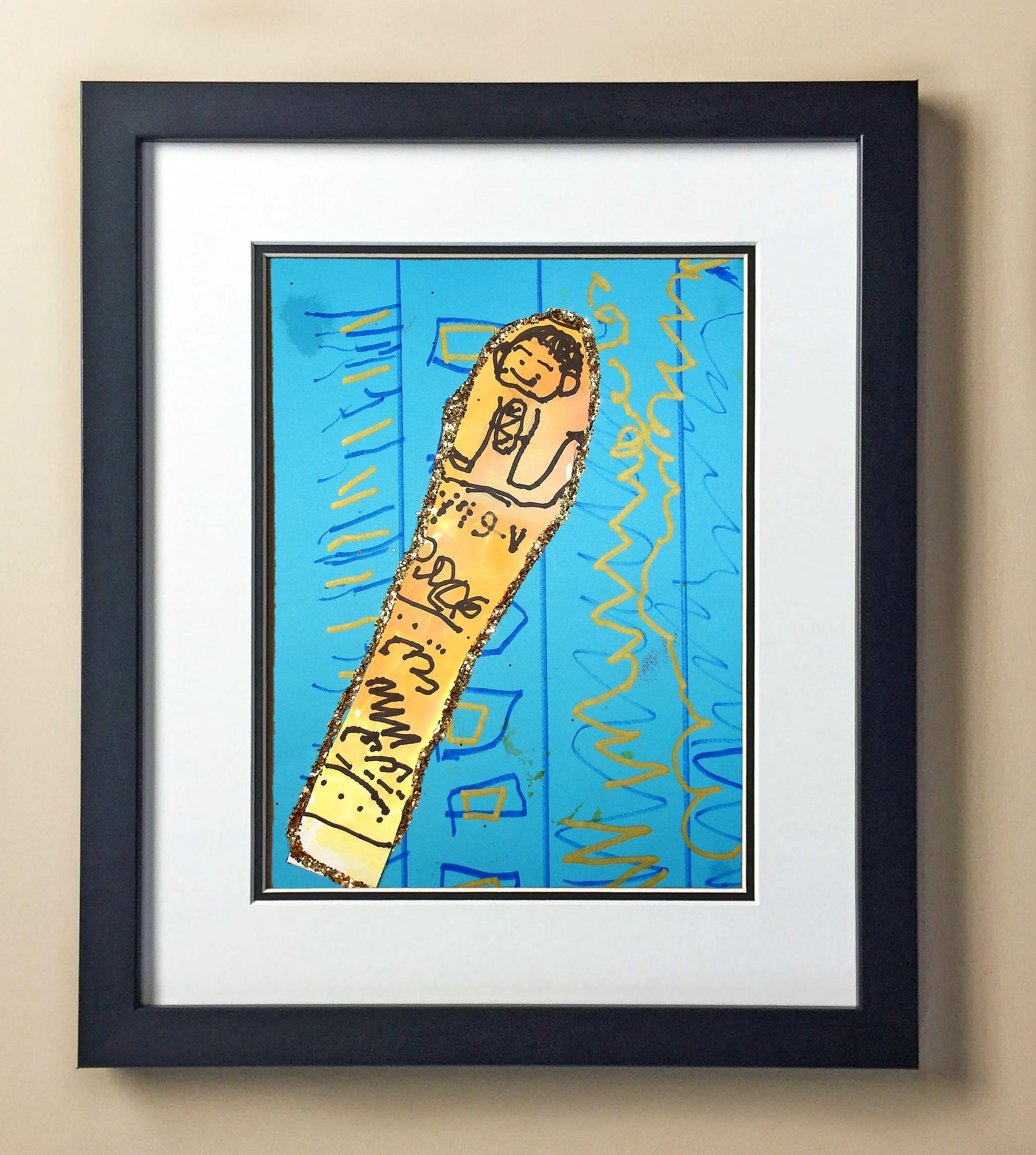 Included with the purchase is the Students Artwork, Frame, double matboard, shatter proof plexiglass, and a ready to hang backerboard with turnbuttons