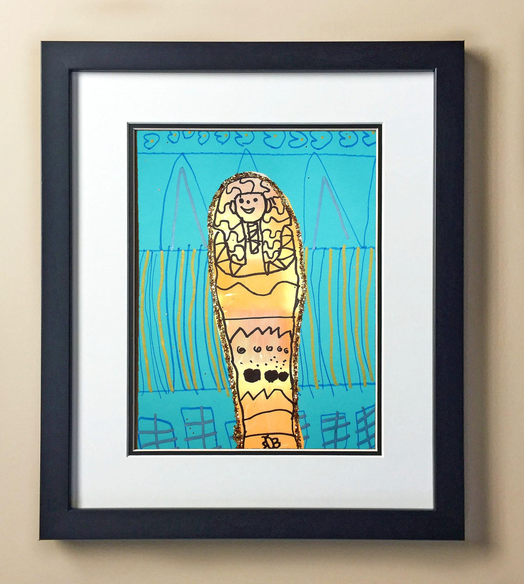 Included with the purchase is the Students Artwork, Frame, double matboard, shatter proof plexiglass, and a ready to hang backerboard with turnbuttons
