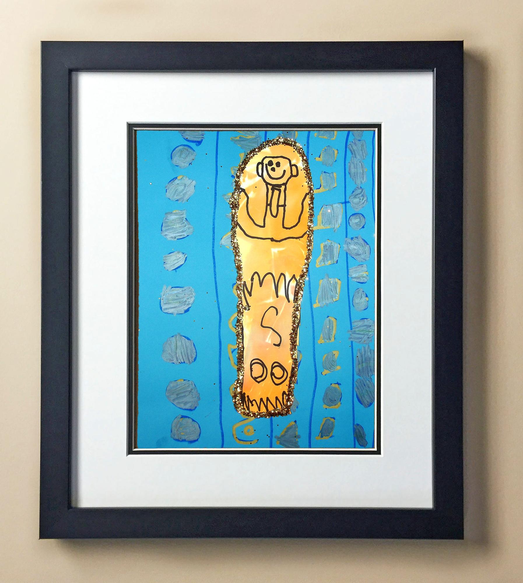 Included with the purchase is the Students Artwork, Frame, double matboard, shatter proof plexiglass, and a ready to hang backerboard with turnbuttons