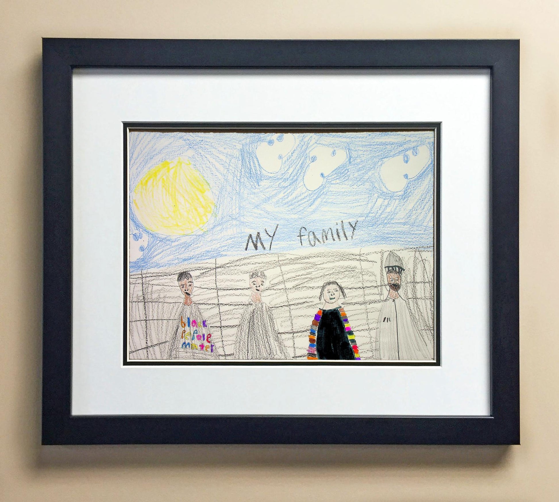 Included with the purchase is the Students Artwork, Frame, double matboard, shatter proof plexiglass, and a ready to hang backerboard with turnbuttons
