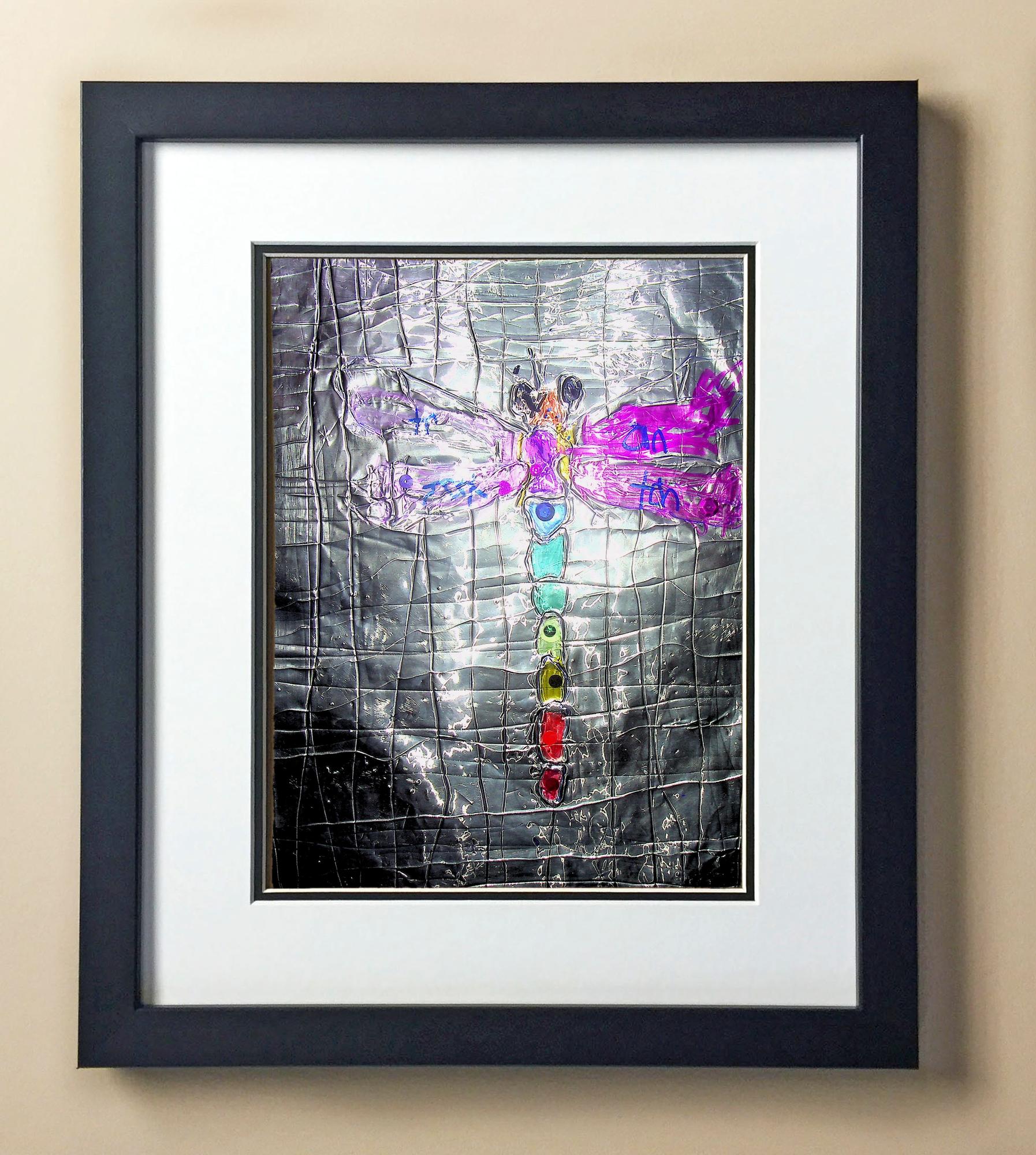 Included with the purchase is the Students Artwork, Frame, double matboard, shatter proof plexiglass, and a ready to hang backerboard with turnbuttons