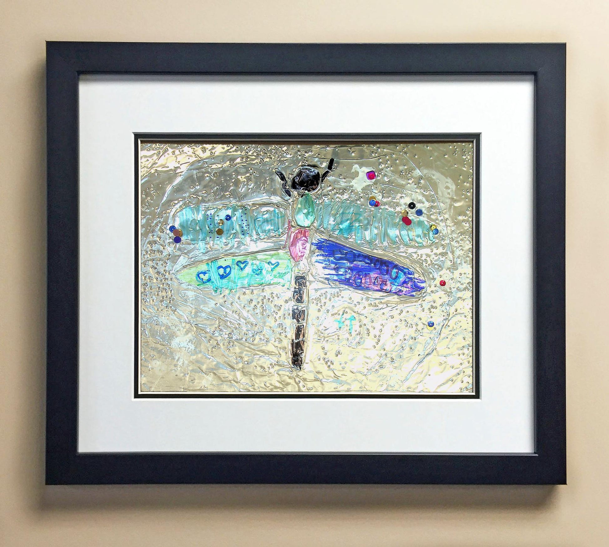 Included with the purchase is the Students Artwork, Frame, double matboard, shatter proof plexiglass, and a ready to hang backerboard with turnbuttons