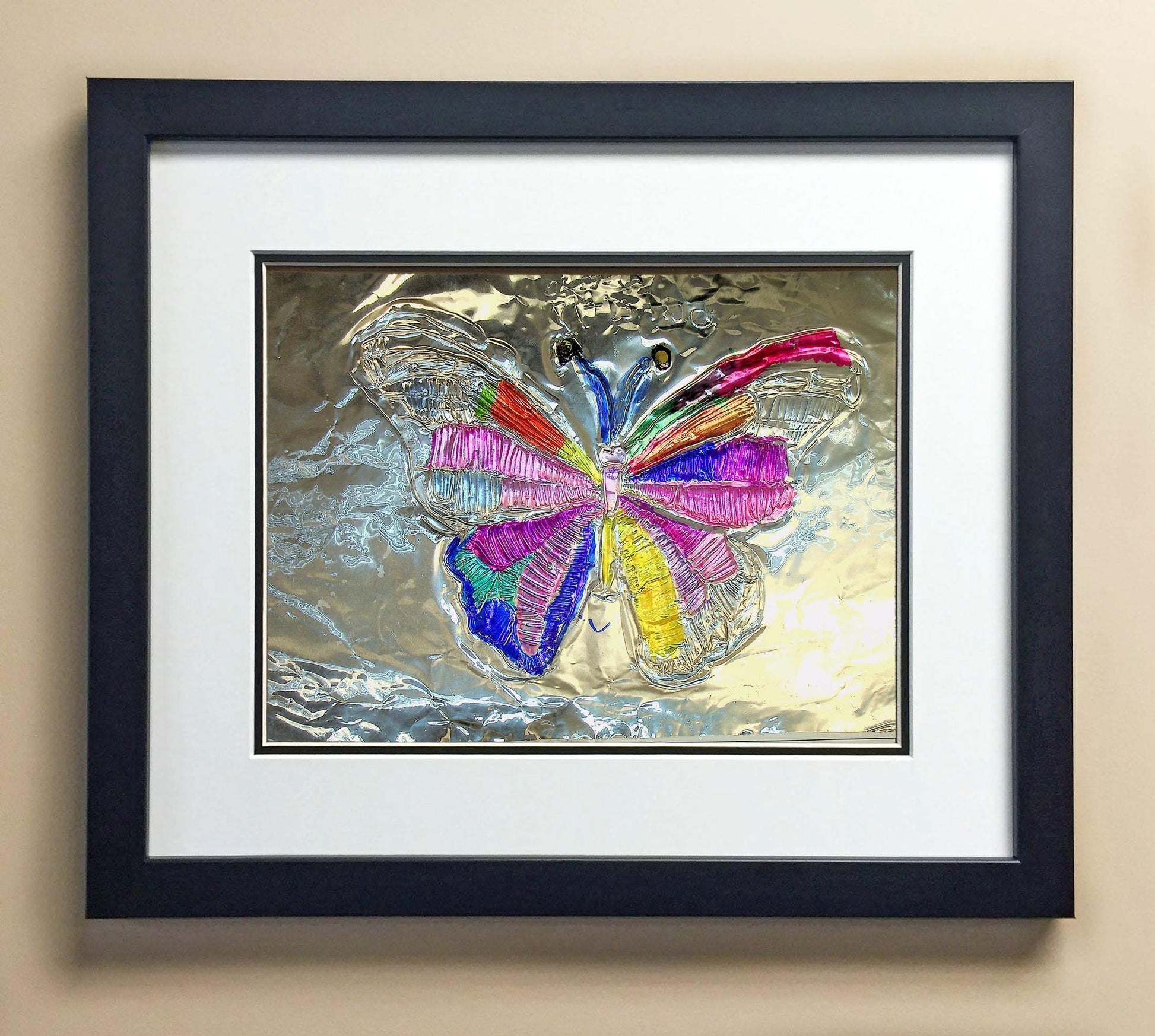 Included with the purchase is the Students Artwork, Frame, double matboard, shatter proof plexiglass, and a ready to hang backerboard with turnbuttons